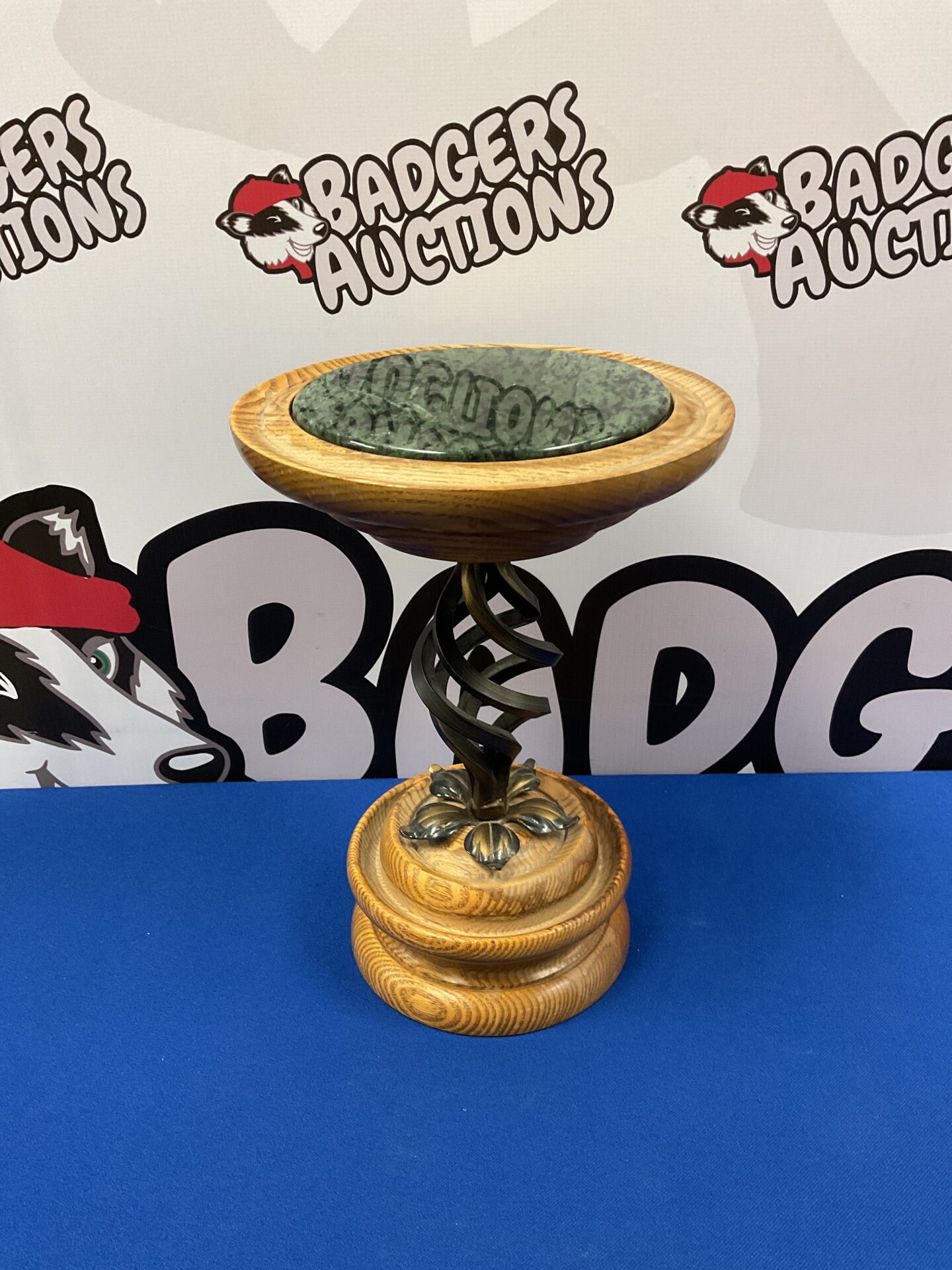 This is a vintage pot stand crafted by P Bennett. The stand features a circular marble top supported by a turned oak column and a tripod base of wrought iron legs. The design blends natural materials with a touch of industrial aesthetic, creating a unique and eye-catching piece.