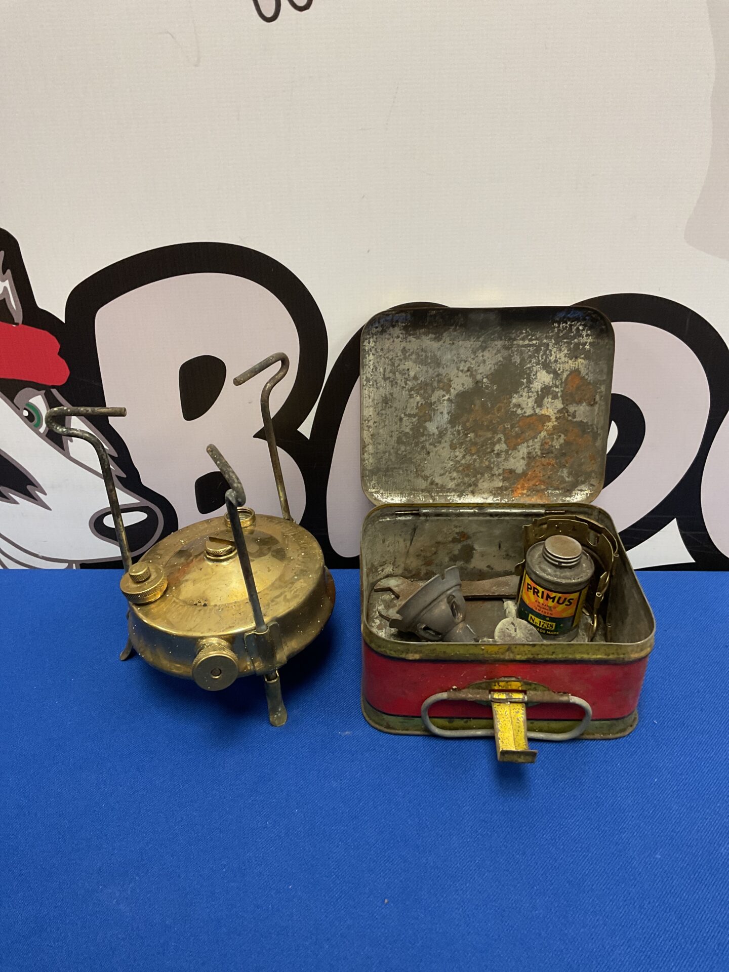 This is a vintage Primus stove, presented in its original tin carrying case. The stove features a brass burner and a spirit cup, designed for use with methylated spirit. The tin itself is painted in a striking red and features a locking mechanism to secure the stove and its accessories during transport. This model is a classic example of early 20th-century camping equipment, favoured by outdoor enthusiasts and adventurers.