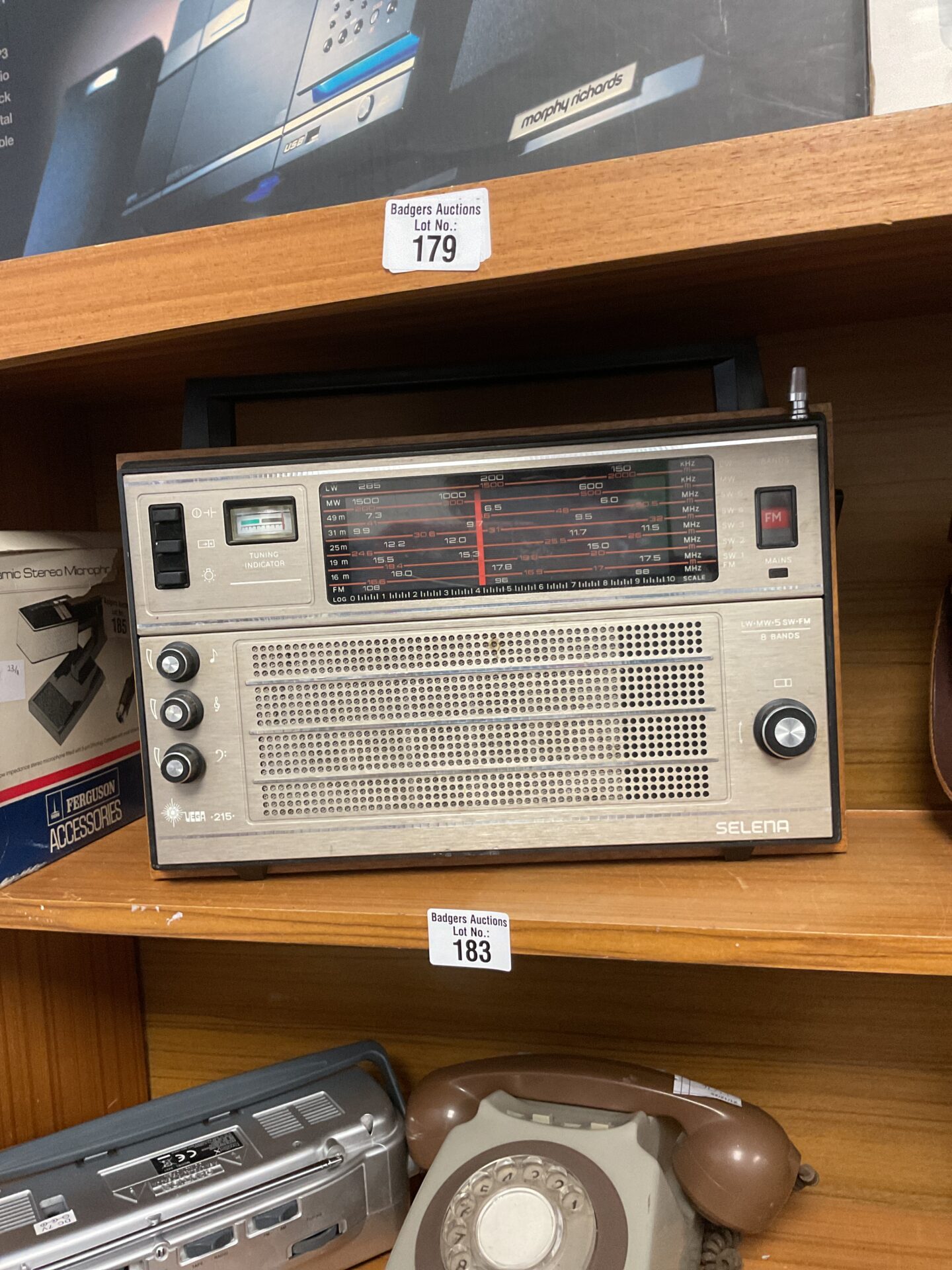 This is a vintage Selena Vega 215 radio receiver, a tabletop analogue radio from a bygone era. The radio features a classic design with a wooden cabinet and a front panel displaying tuning scales for multiple bands. It offers a nostalgic aesthetic and a glimpse into the history of radio technology, appealing to enthusiasts and collectors alike.