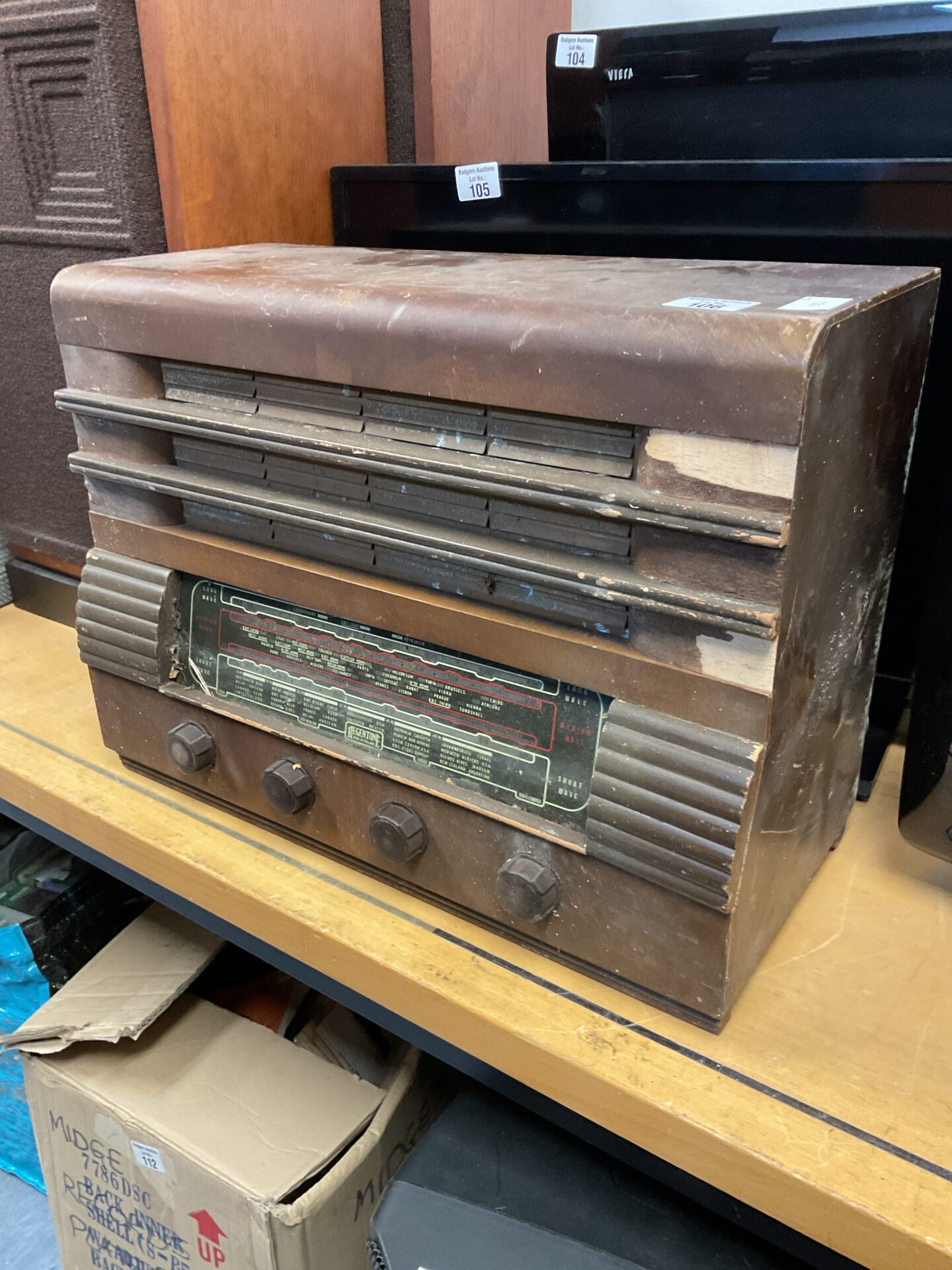 This is a classic Regentone valve radio, a beautiful example of mid-century design. The radio features a wooden cabinet with a distinctive ribbed front, housing the internal components and speaker. It’s a true piece of nostalgia, evoking a bygone era of broadcast entertainment and offering a warm, analogue sound.