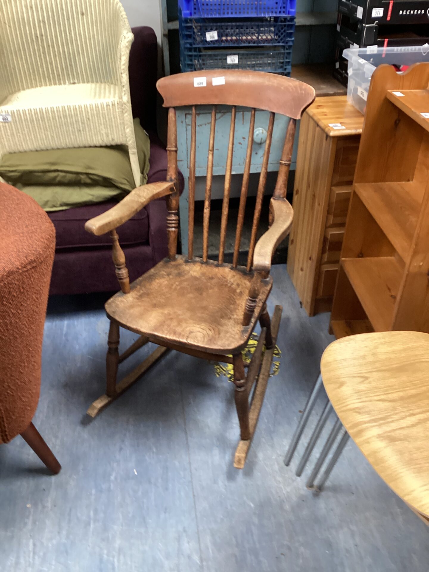 This rocking chair shows signs of age and wear consistent with its vintage nature. It may exhibit minor imperfections, such as scratches or fading, which contribute to its character. This chair would appeal to collectors of antique furniture or those seeking a unique and charming addition to their home.