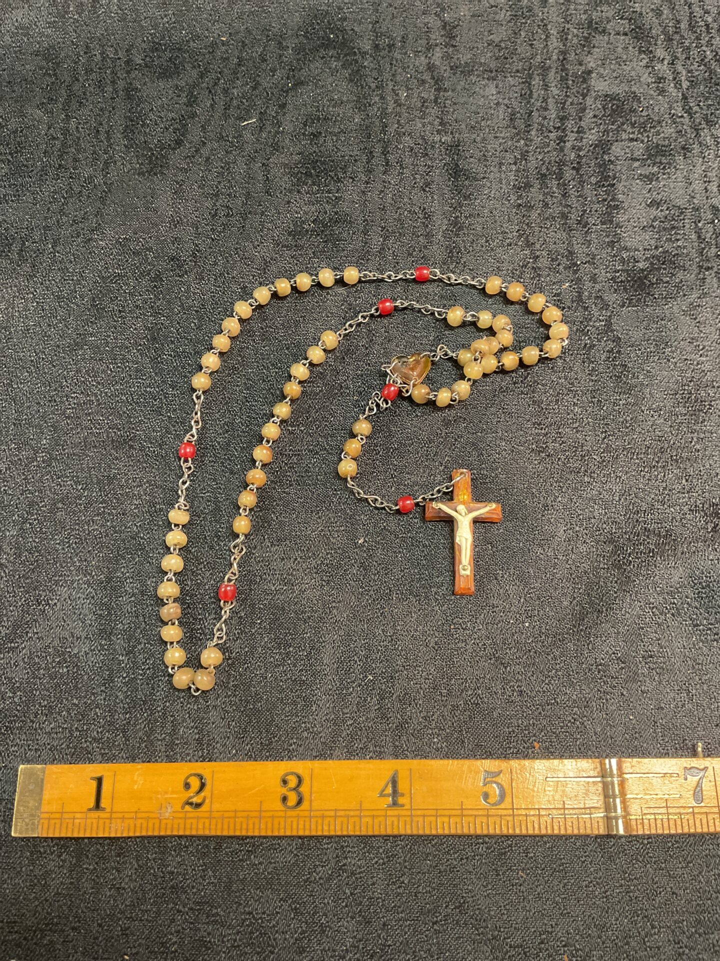 The rosary appears to be in good vintage condition, with expected wear consistent with age and use. While there may be minor imperfections or patina, these only add to the character and authenticity of the piece. This rosary would be a wonderful addition to a collection of religious artifacts, vintage jewelry, or antique devotional items, appealing to collectors and those interested in historical religious practices.