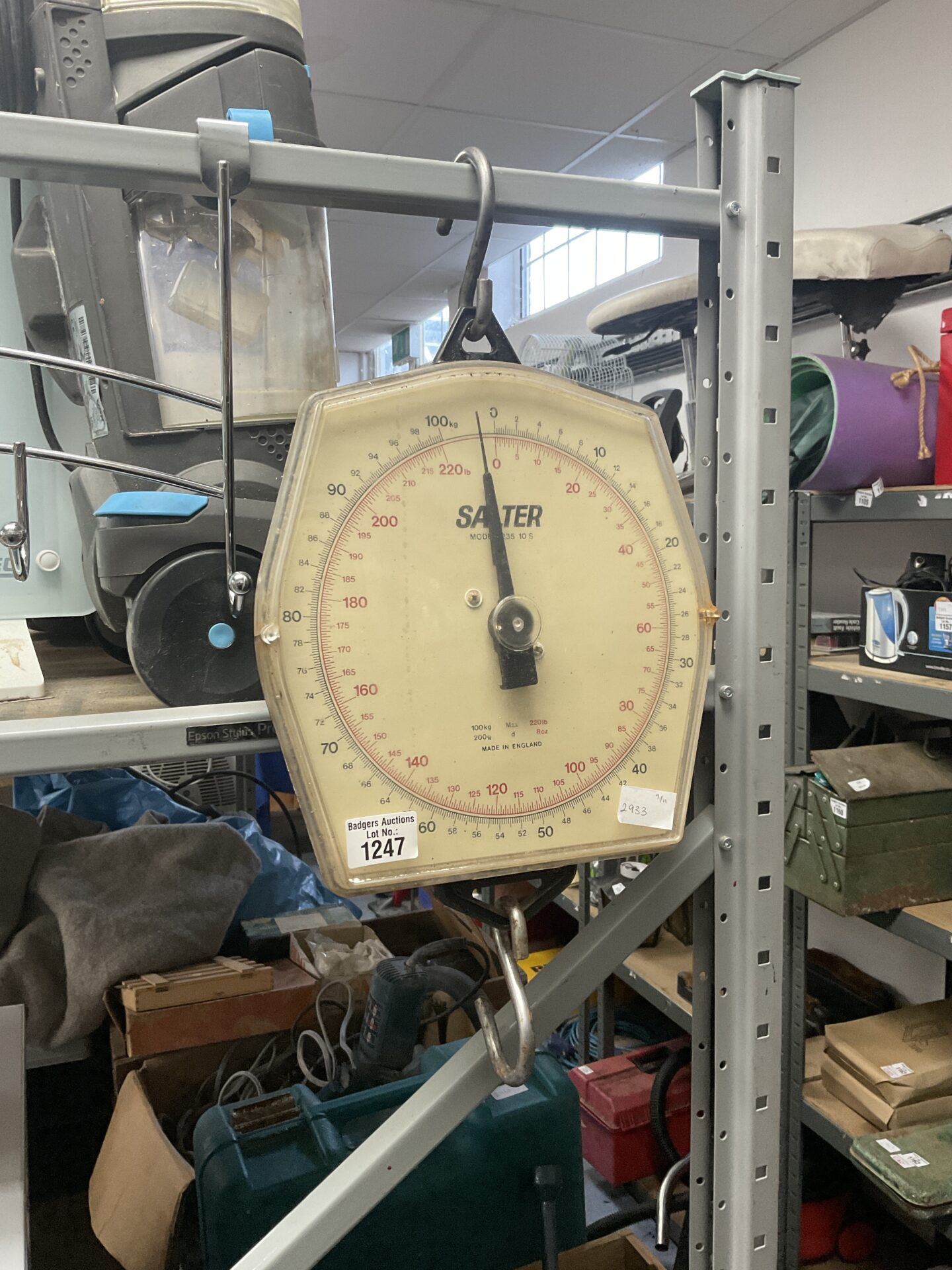 This is a set of vintage Salter hanging scales, a classic example of early 20th-century weighing technology. These scales feature a robust metal construction and a clear, easy-to-read dial, marked in both pounds and kilograms. The design is functional and aesthetically pleasing, reflecting the quality craftsmanship of the Salter brand.