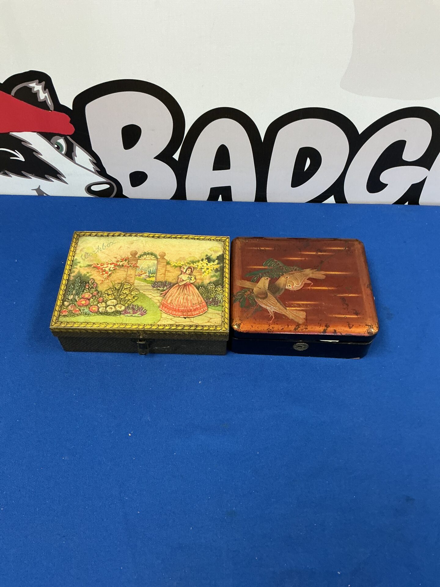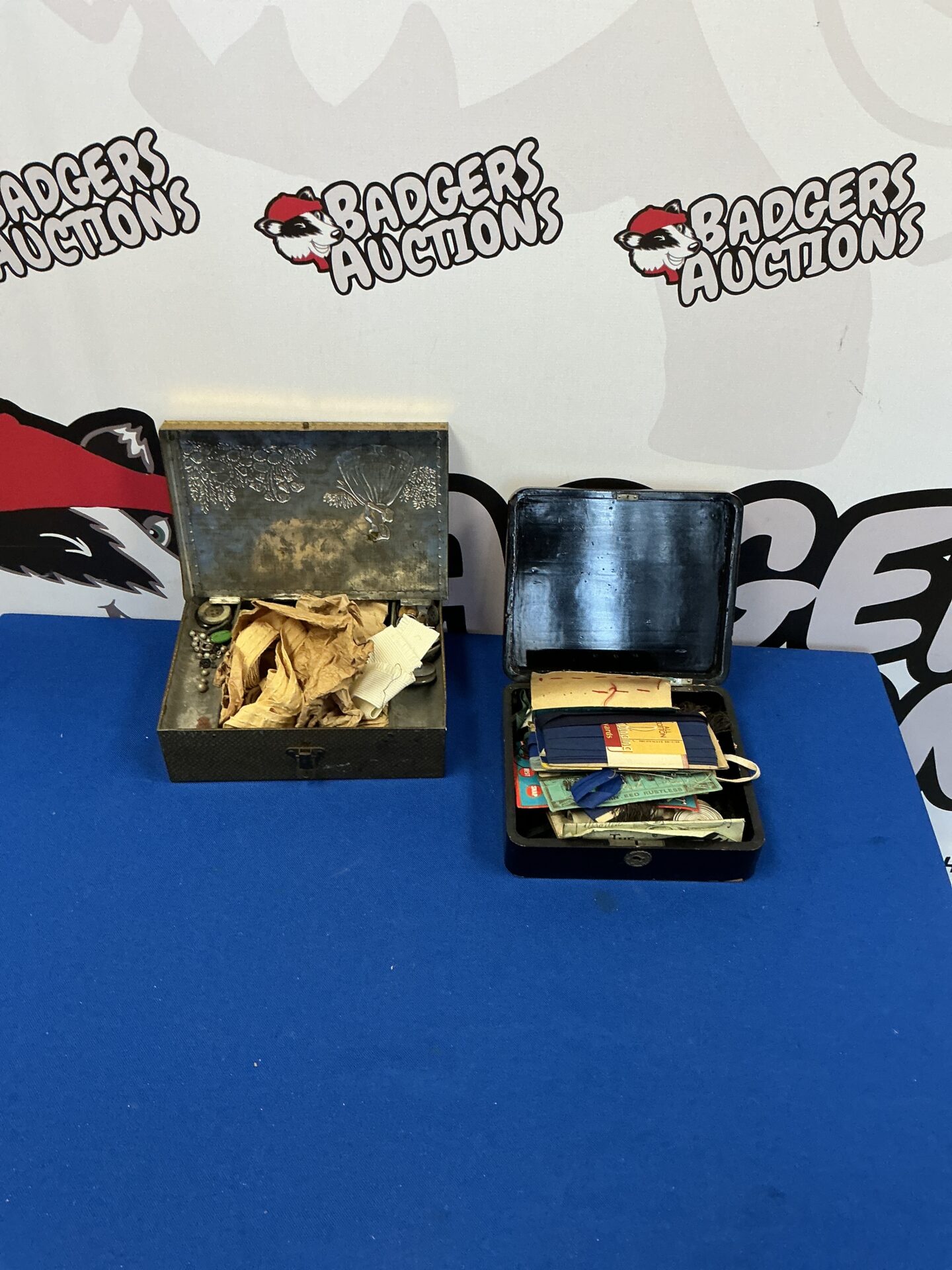 This lot features two vintage sewing boxes, each offering a glimpse into the history of needlework and domestic crafts. The first box is a darker, rectangular shape with a decorative painted scene on the lid. The second box is smaller and also features a painted design. Both boxes contain a variety of vintage sewing tools, threads, and fabric scraps, suggesting they were actively used for many years.
