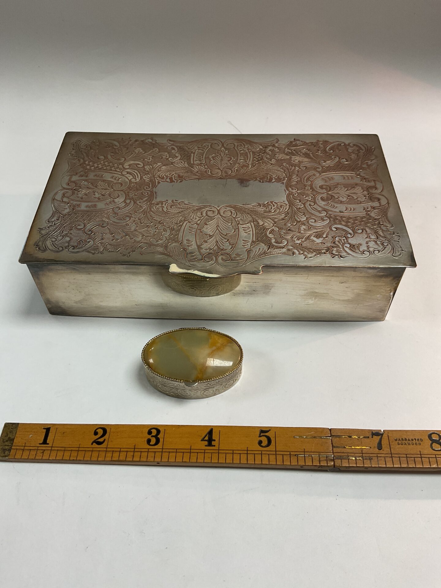 This charming set comprises two silver plate boxes, a larger cigarette box and a smaller pill box. The cigarette box features intricate embossed detailing, likely floral or foliate motifs, across its lid and sides. The smaller pill box echoes this design, offering a coordinated aesthetic. Both pieces exhibit the craftsmanship typical of silver plate items from the early to mid 20th century, intended for display and practical use.