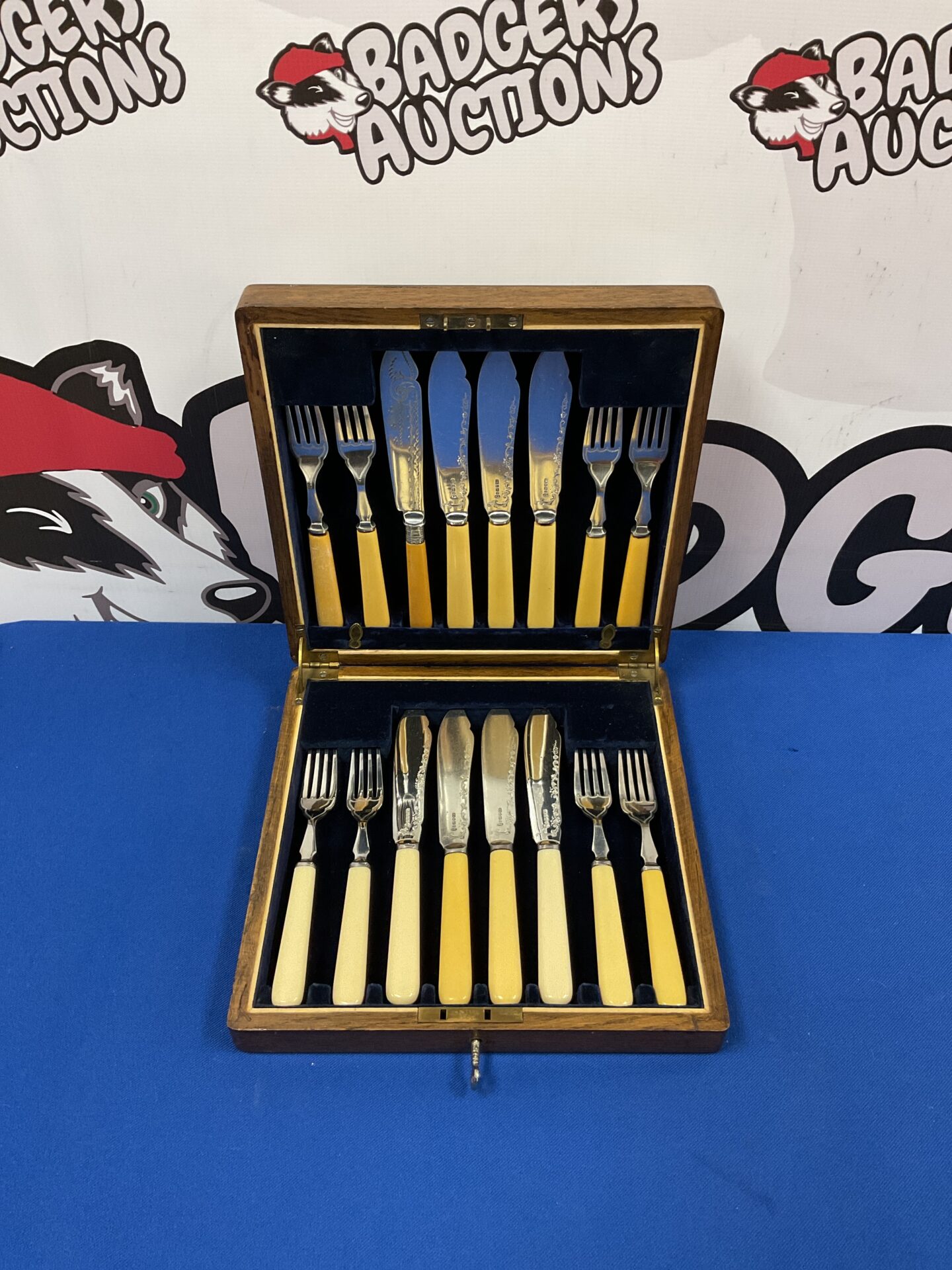 This set presents as a well-preserved example of vintage silver plate cutlery. While showing signs of age and use, the silver plate retains much of its original lustre. The bone handles are intact, though may exhibit minor wear consistent with age. This set would be a welcome addition to a collection of antique silverware or vintage dining accessories, appealing to collectors and enthusiasts of bygone eras.