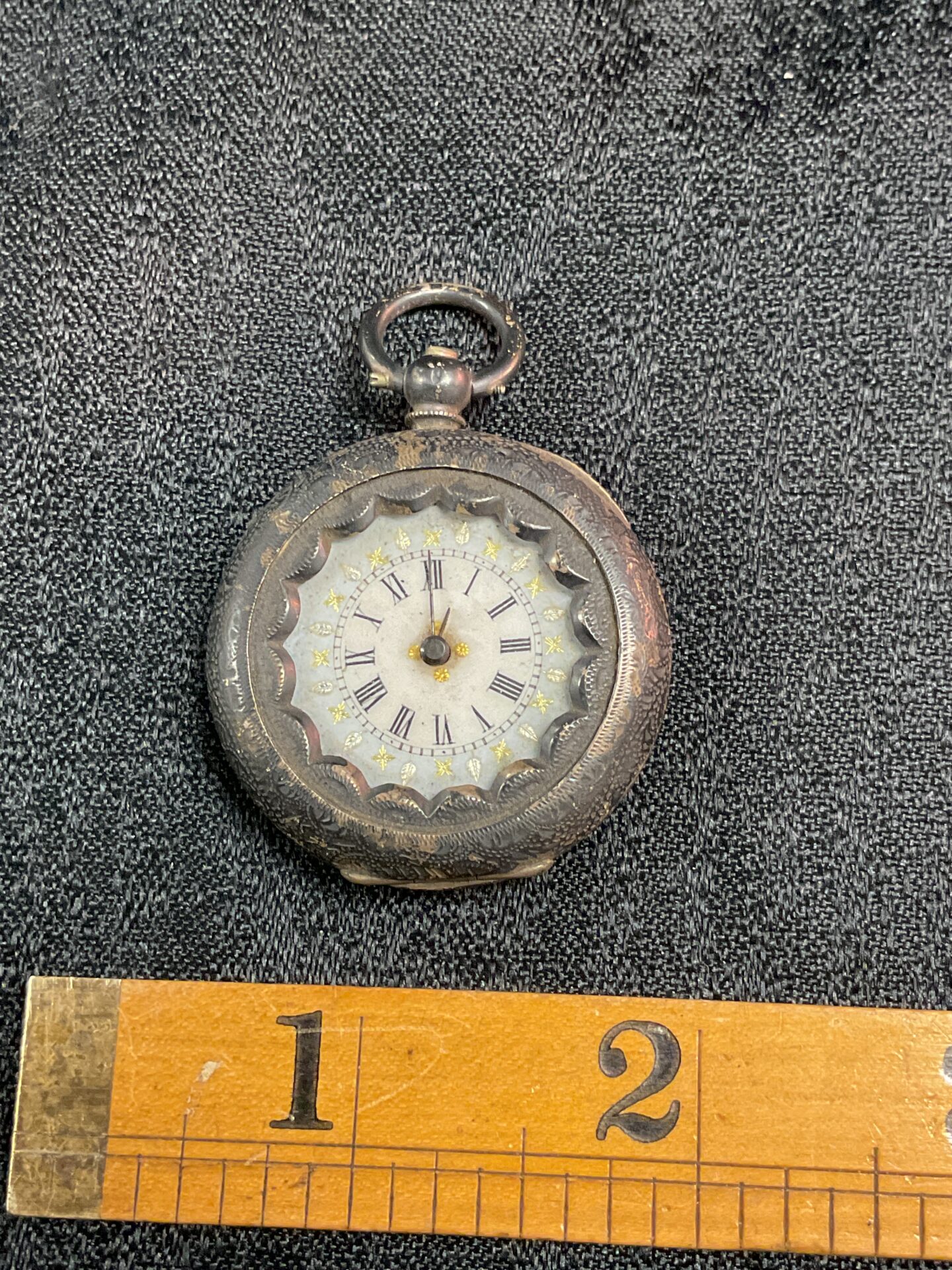 This is a vintage pocket watch crafted from 935 silver. The watch features a decorative face with Roman numerals and ornate detailing. The case is hallmarked with ‘935’ indicating the silver content, and bears the number ‘7077’ etched into the inner case. It is a classic example of a turn-of-the-century timepiece, likely intended as a gentleman’s accessory.