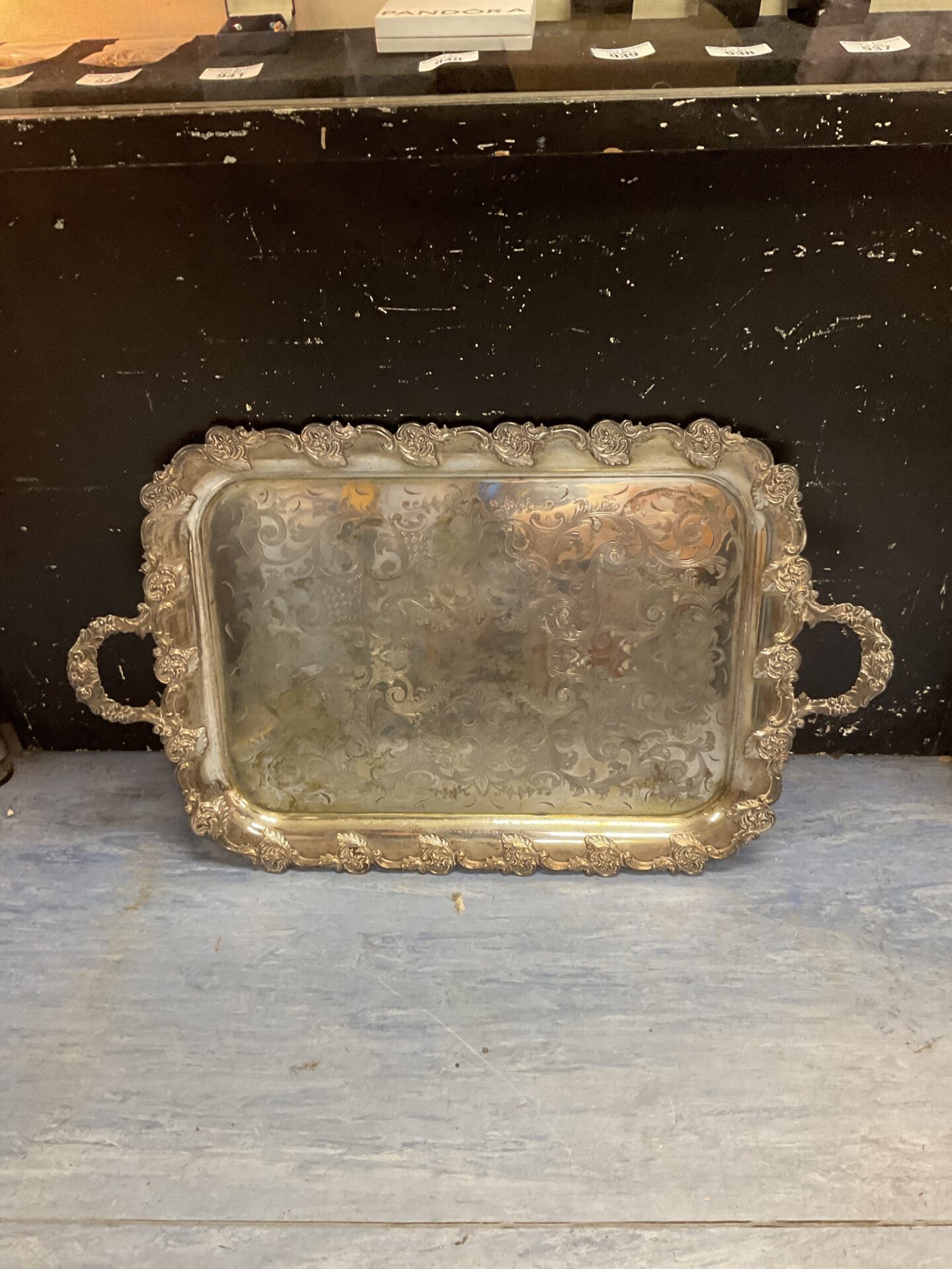 The tray exhibits signs of age and use, consistent with its vintage nature, adding to its character and charm. While there may be minor imperfections or wear to the silverplate, these do not detract from its overall beauty or functionality. This tray would be a wonderful addition to a collection of antique silverplate, or a unique and stylish serving piece for those who appreciate vintage aesthetics.
