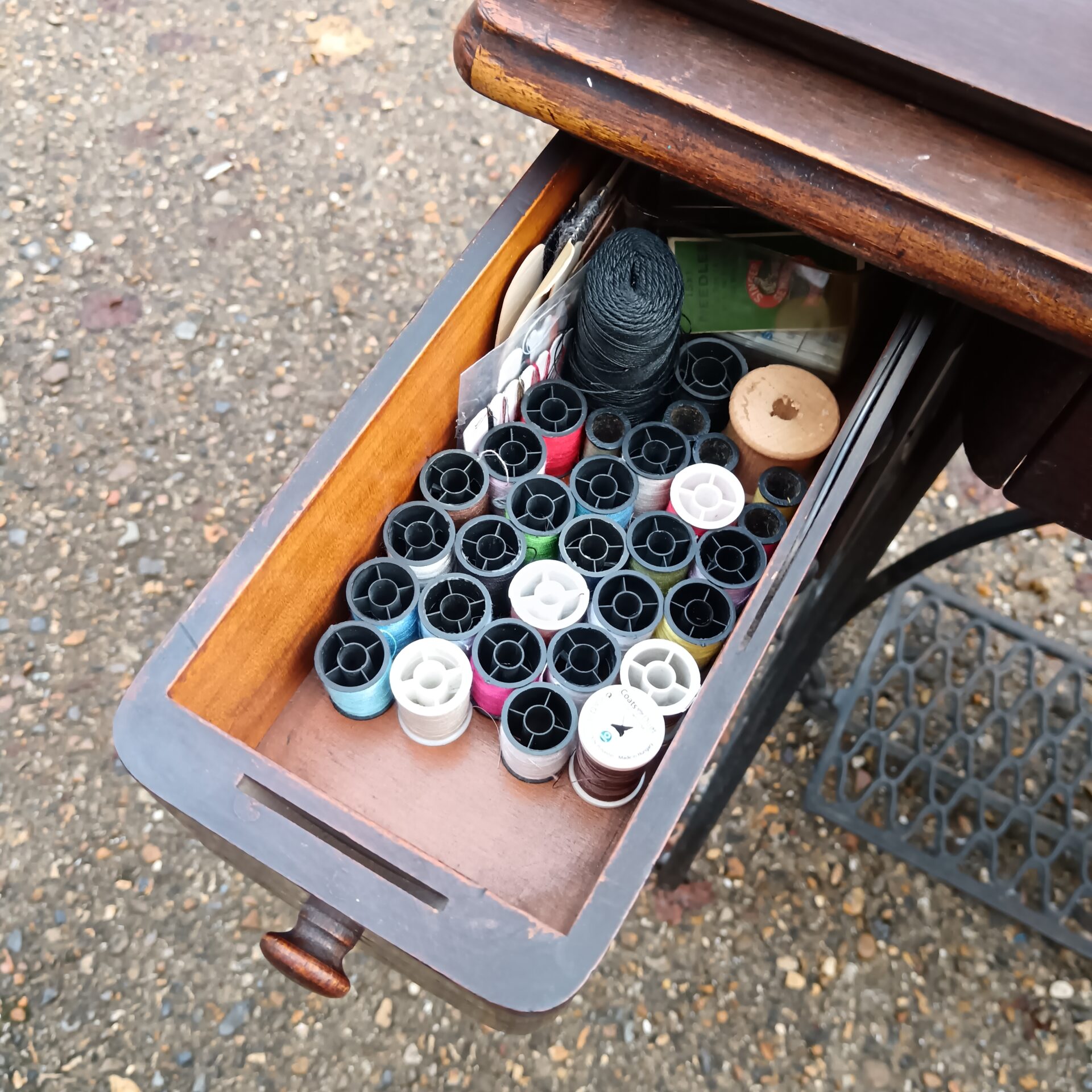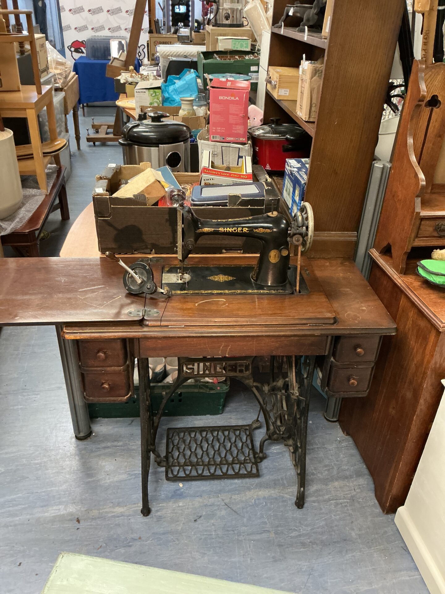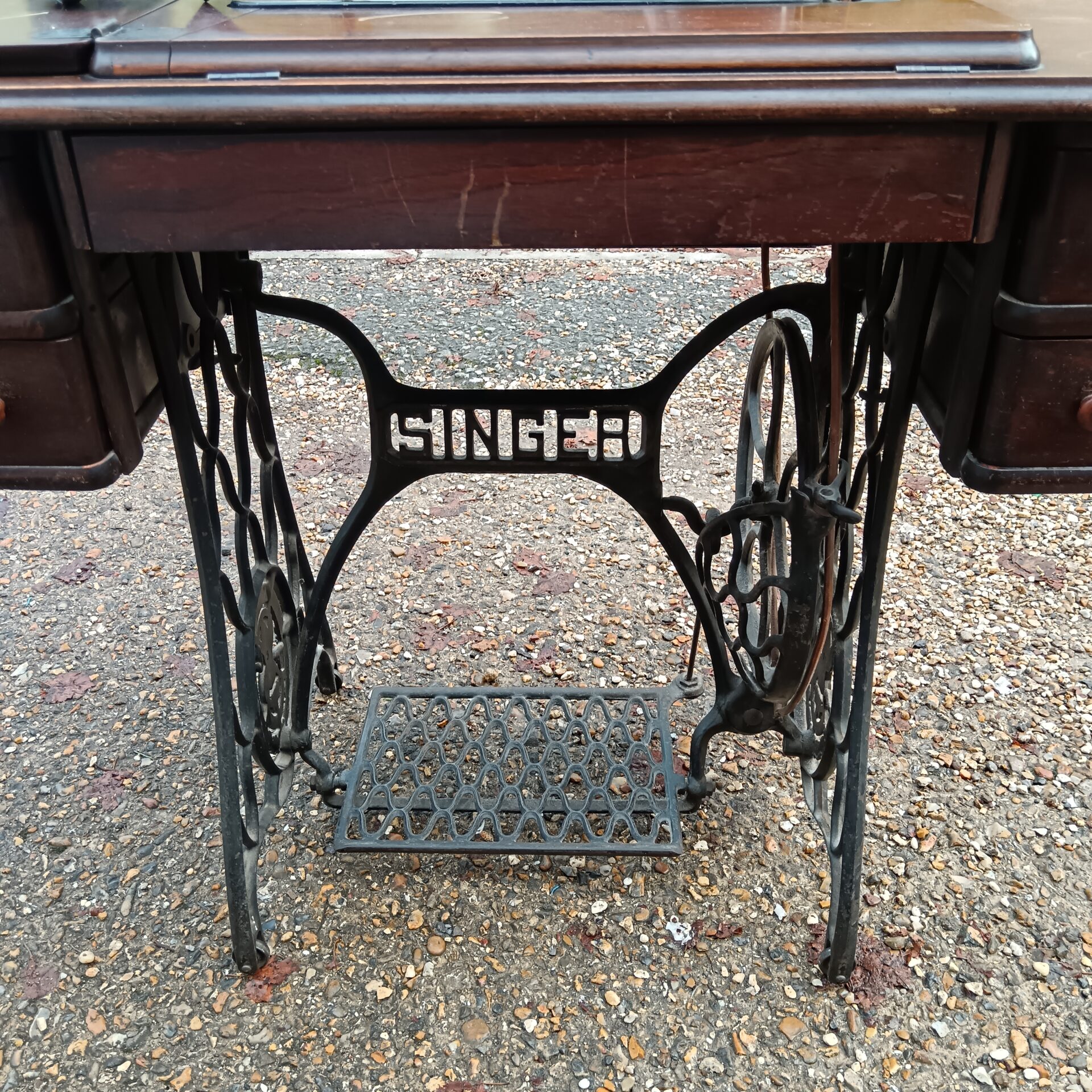 This is a vintage Singer sewing machine table, featuring a dark wood construction and classic design. The table incorporates the original treadle mechanism, though its functionality is unknown. It boasts a hinged top that lifts to reveal storage space, and two small drawers on either side for keeping sewing essentials. The cast iron base provides stability and a touch of industrial charm.
