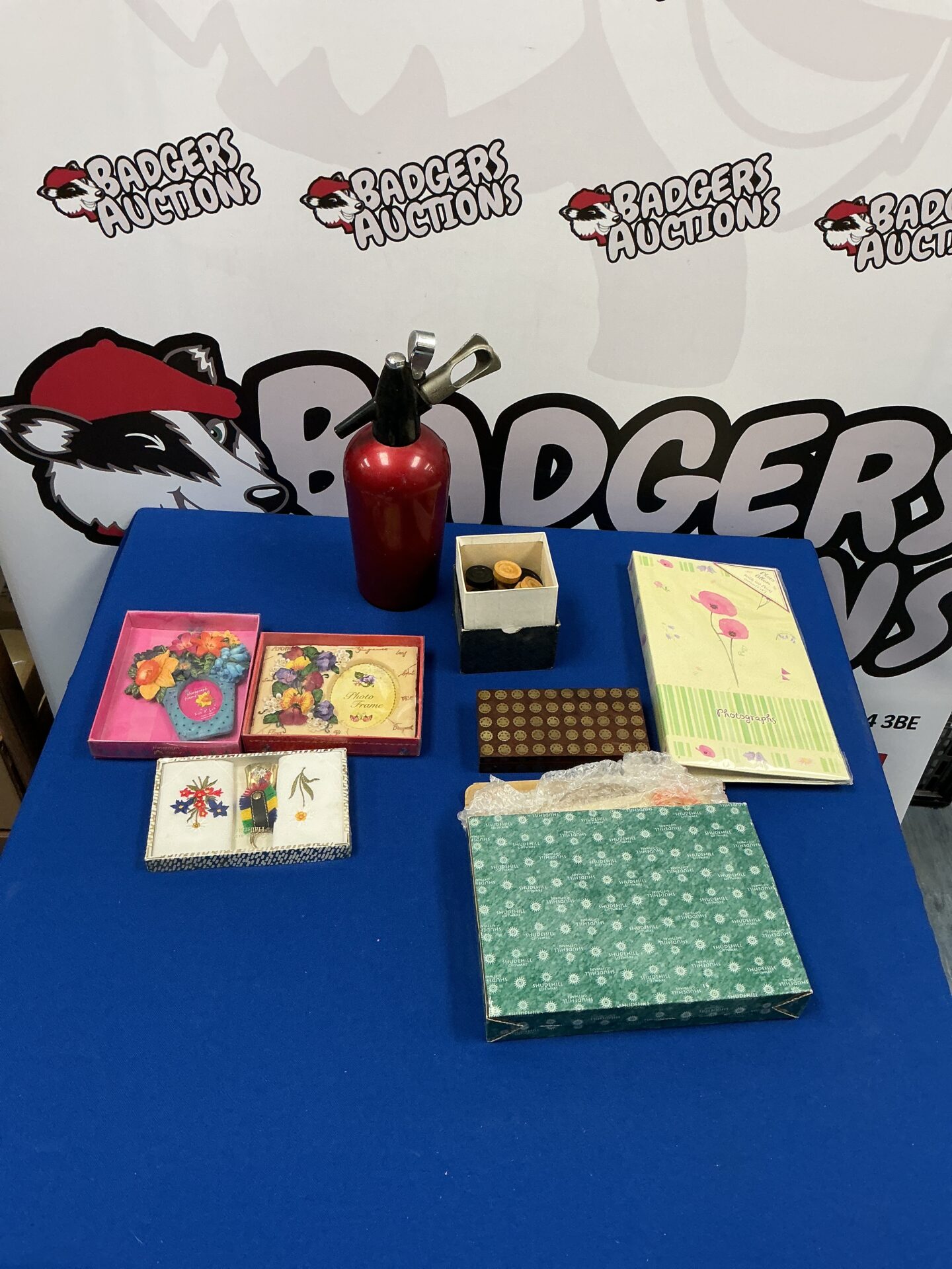 This lot features a vintage Sparklets soda syphon, a classic method for creating carbonated beverages at home. The syphon is constructed from metal and designed to use Sparklets bulbs to carbonate water, offering a nostalgic and charming way to enjoy fizzy drinks. It’s accompanied by a collection of vintage postcards, adding to the lot’s eclectic appeal.