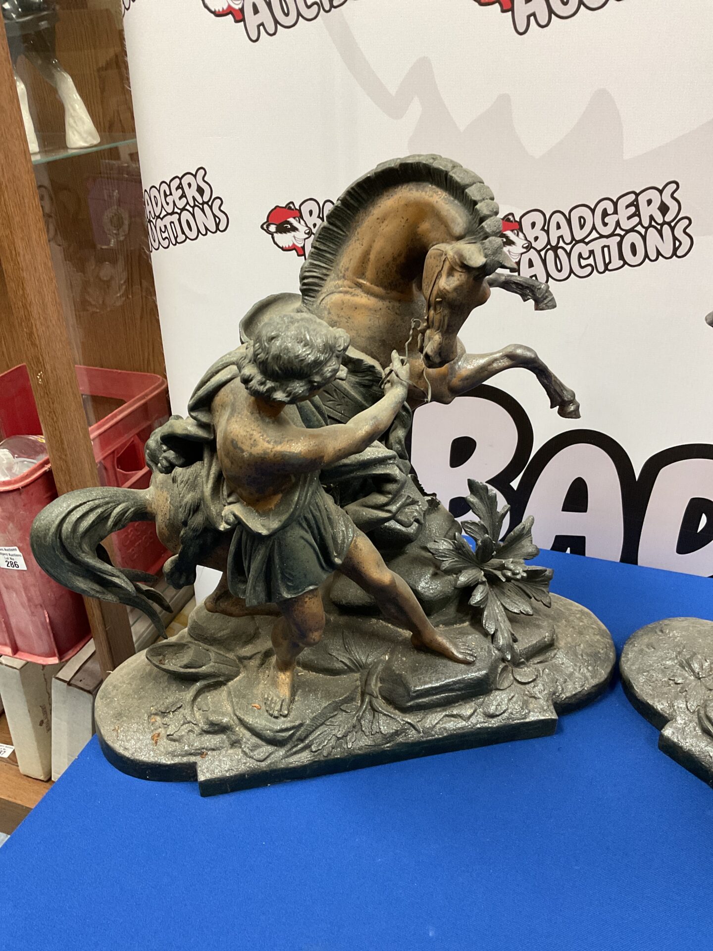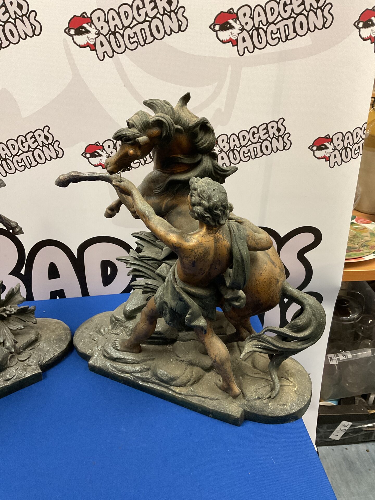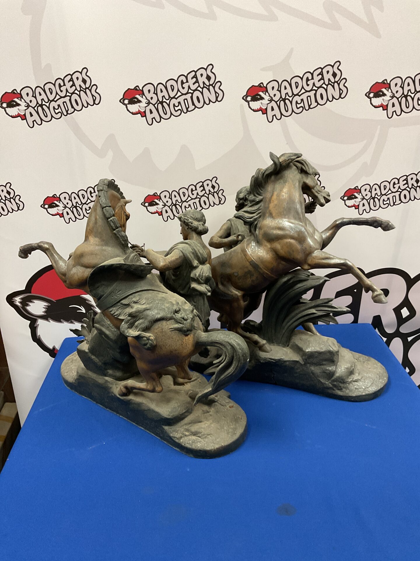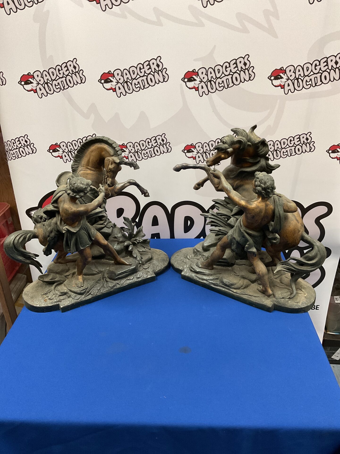 These sculptures show signs of age and wear consistent with their vintage nature. There are areas of patina variation and minor surface imperfections, which contribute to their antique character. These sculptures would be a desirable addition to a collection of equestrian art, vintage statuary, or antique metalwork, appealing to collectors and enthusiasts alike.