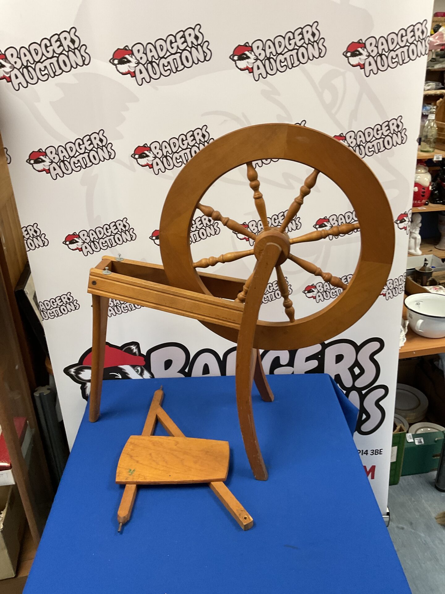 This spinning wheel shows signs of age and use, with wear and patina consistent with its vintage. While it presents well, it has not been tested for functionality and is sold as a decorative item or for restoration. Collectors and enthusiasts will appreciate its authentic character and potential for display or as a unique addition to a fibre arts collection.
