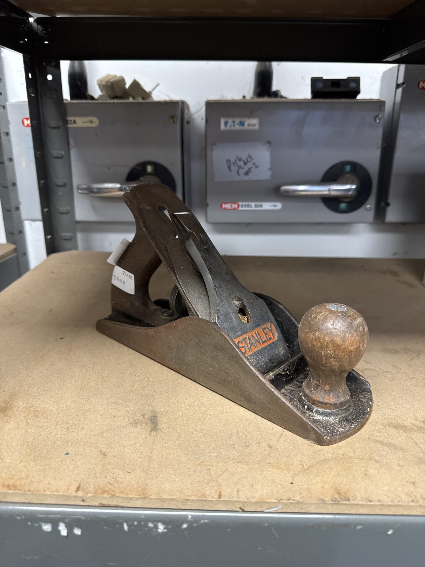 This is a vintage Stanley Bailey wood plane, a classic tool for woodworking enthusiasts and collectors. The plane features a robust metal body and blade, typical of Stanley’s quality craftsmanship. It is designed for smoothing and shaping wood, and its construction suggests it was intended for regular use in a workshop setting.
