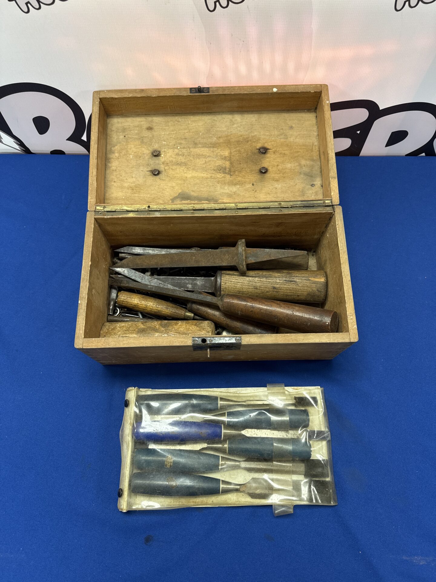 The chisels and box display wear consistent with age and use, including surface scratches, patina, and minor imperfections. While the set is not assessed for functionality, it presents well as a collectible item for tool enthusiasts or those interested in vintage woodworking equipment. The set’s age and apparent originality make it a desirable piece for collectors.
