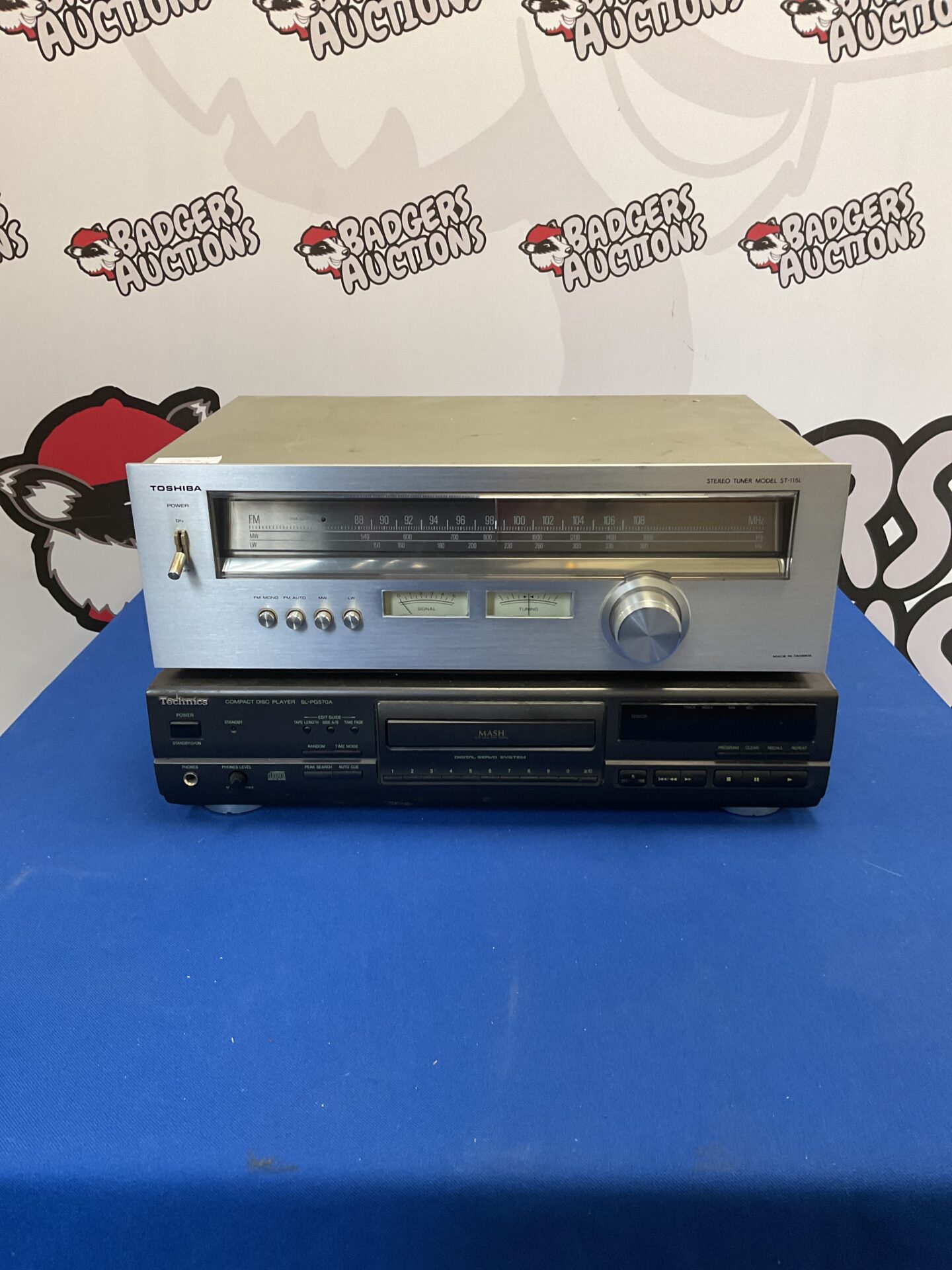 This lot features a Toshiba stereo tuner, model ST-115L, paired with a Technics CD player, model SL-PG570A. This combination represents a classic setup for audiophiles and collectors of vintage audio equipment. The Toshiba tuner offers precise frequency selection, while the Technics CD player delivers high-fidelity digital audio playback. Both units showcase the design aesthetics of their era, blending functionality with a sleek, modern look.