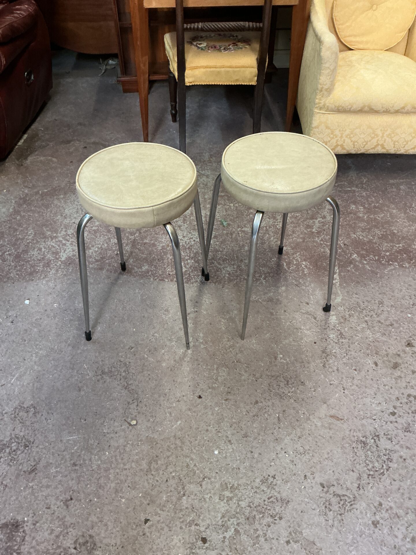 This lot comprises a pair of vintage stools, likely dating from the mid-20th century. They feature circular seats upholstered in a neutral tone, supported by slender, tapering legs. The simple, clean lines suggest a mid-century modern aesthetic, making them versatile additions to various interior styles. These stools would suit a kitchen breakfast bar, a retro diner setting, or as accent seating throughout the home.