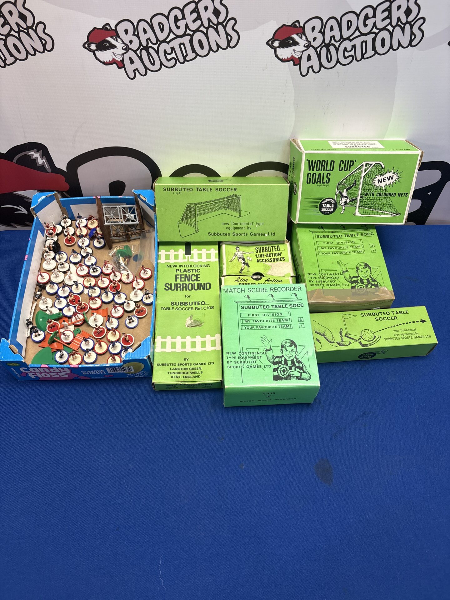 This lot comprises a selection of vintage Subbuteo football items, including players and accessories. The collection appears to represent various eras of the popular table football game, offering a glimpse into its history. The boxed sets and individual components showcase the classic design and quality associated with the Subbuteo brand.