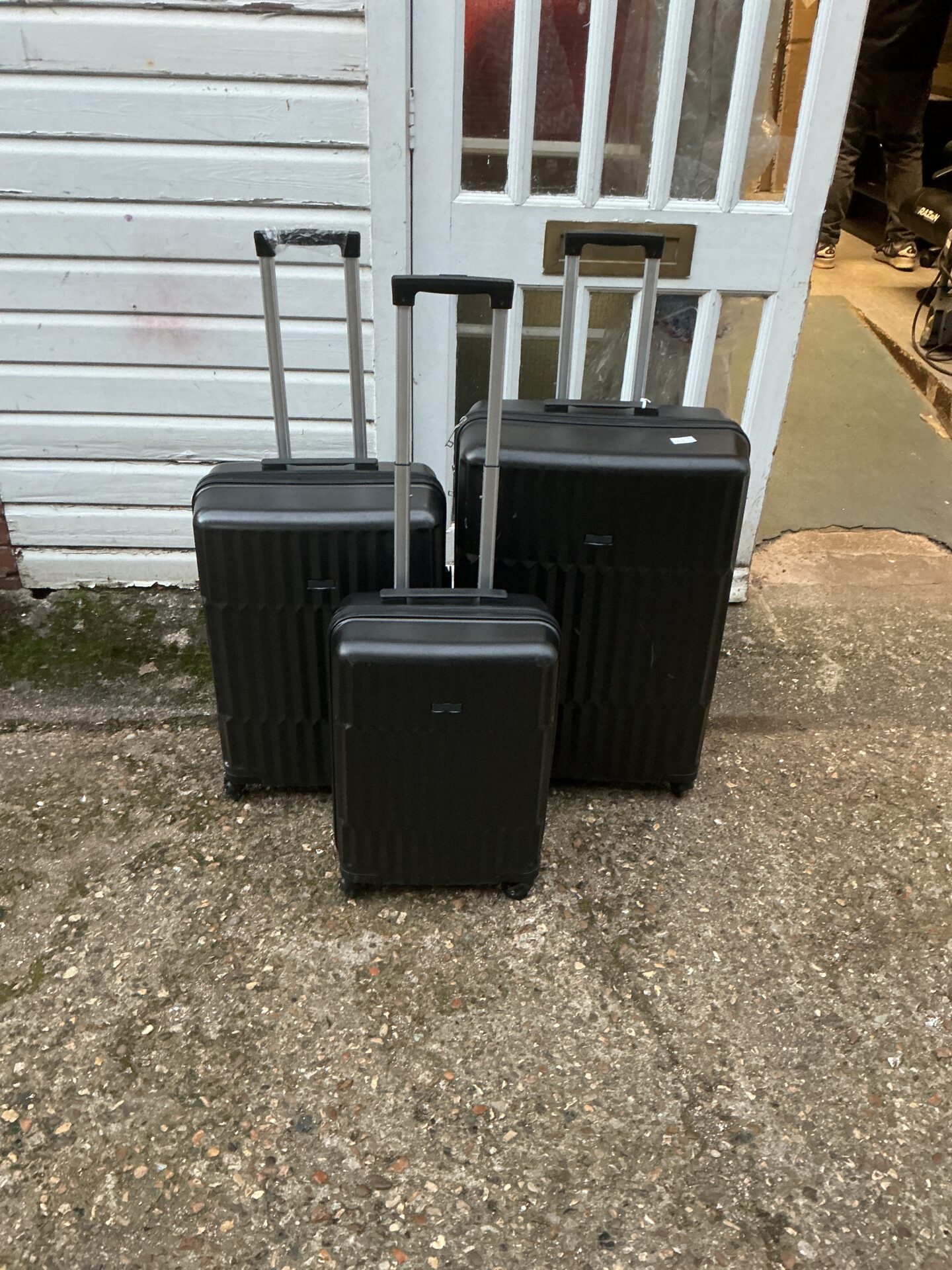 This lot comprises three matching hard shell suitcases, presented in a classic black finish. The suitcases are of varying sizes, offering a complete set for organised travel or stylish storage. Their robust construction suggests durability, and the design evokes a sense of mid-century travel glamour.