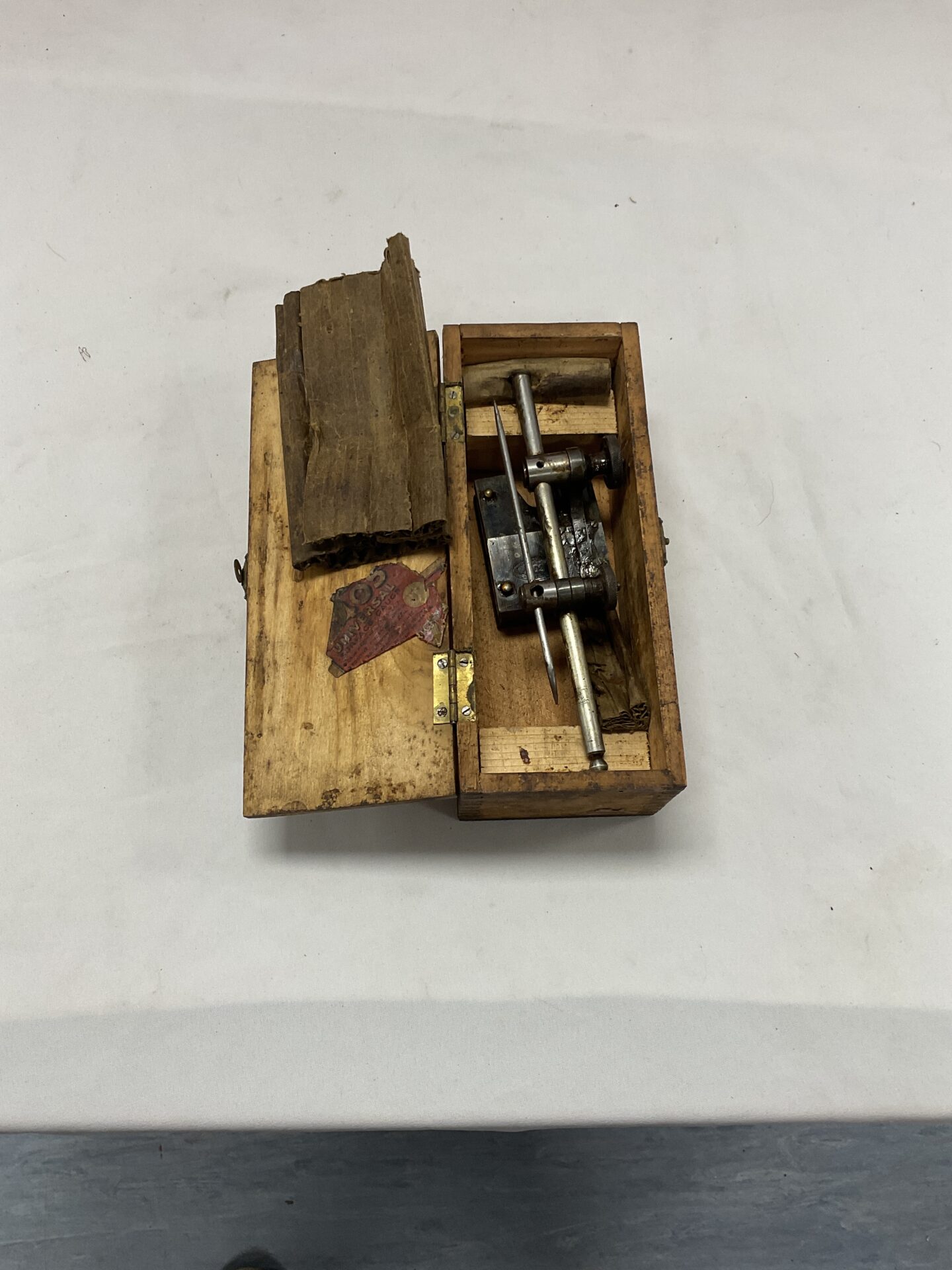 This surface gauge exhibits wear consistent with age and use, including surface scratches and patina. The wooden case shows signs of wear and some damage, but remains structurally sound. This piece would be of interest to collectors of antique tools, machinists, or anyone interested in the history of precision measurement.