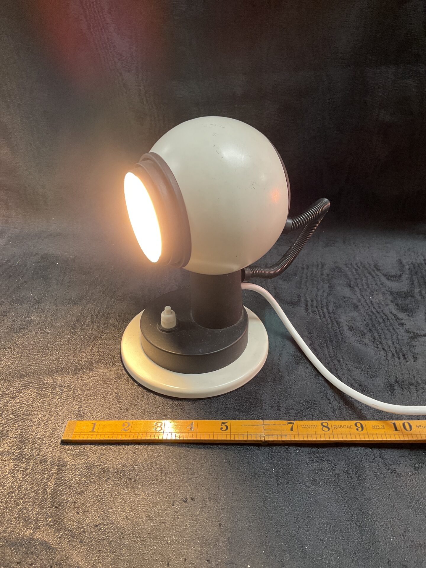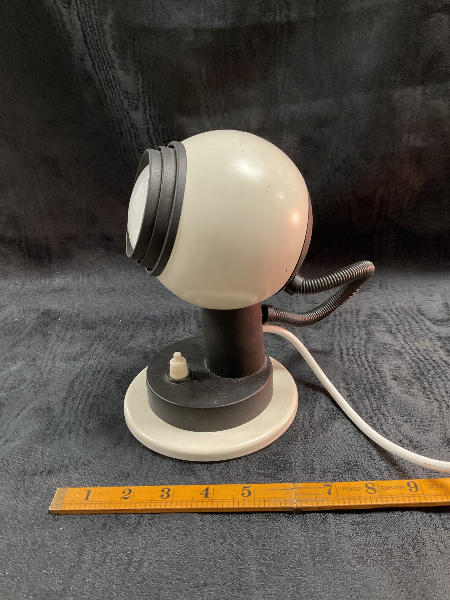 This is a vintage table lamp by First Light Products, featuring a distinctive spherical shade and a magnetic base. The lamp has an off-white finish with black accents, creating a classic mid-century modern aesthetic. A white on/off switch is present on the base. The flexible neck allows for adjustable positioning of the light.