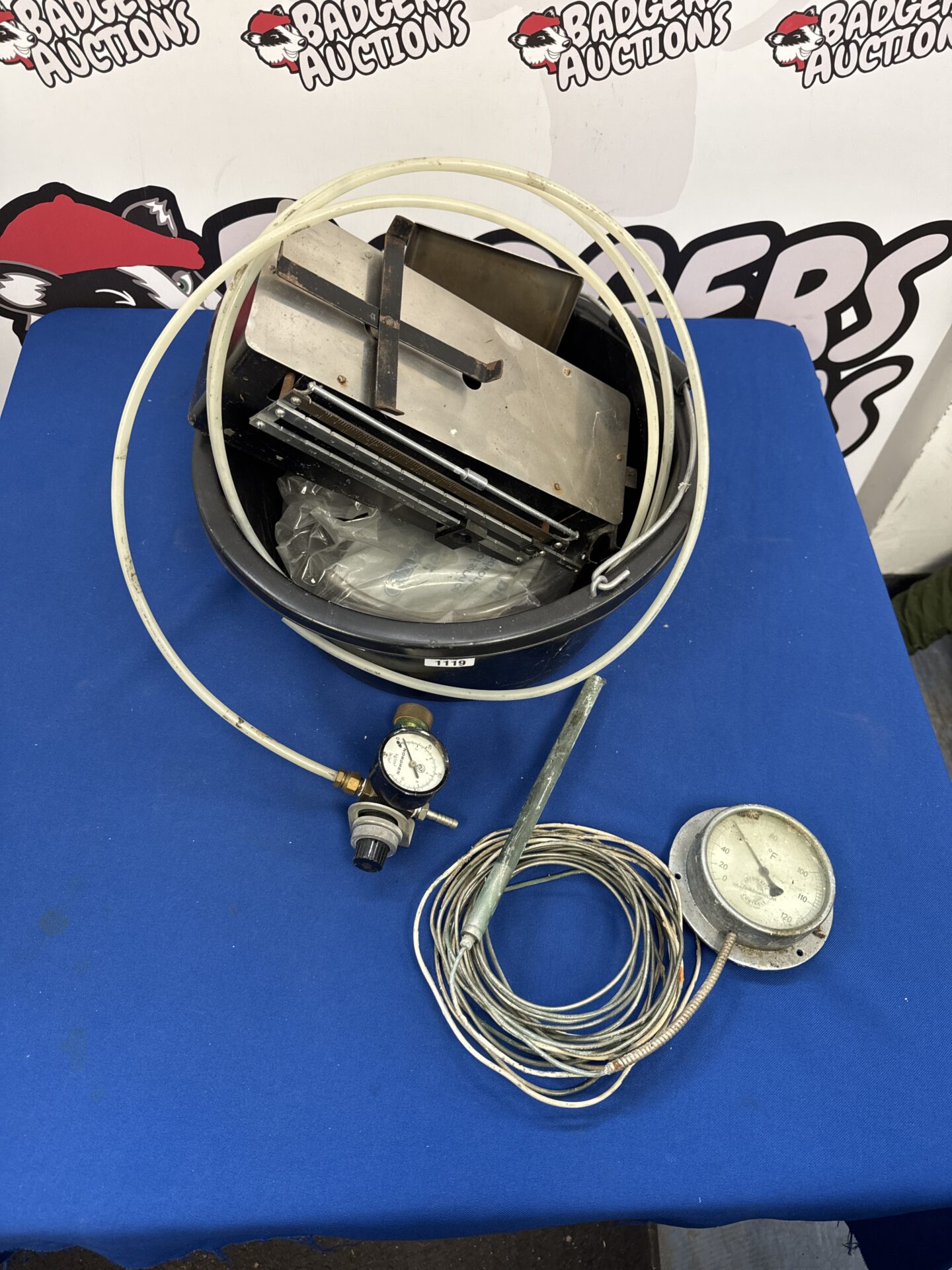 This is a vintage Teddington Automatic Controls temperature gauge, likely part of a set used with balance scales or other scientific/industrial equipment. The gauge features a circular dial with temperature readings, connected to a coiled tube and fittings for connection to a system. The gauge appears to be constructed from metal with a glass face, exhibiting a classic industrial aesthetic.