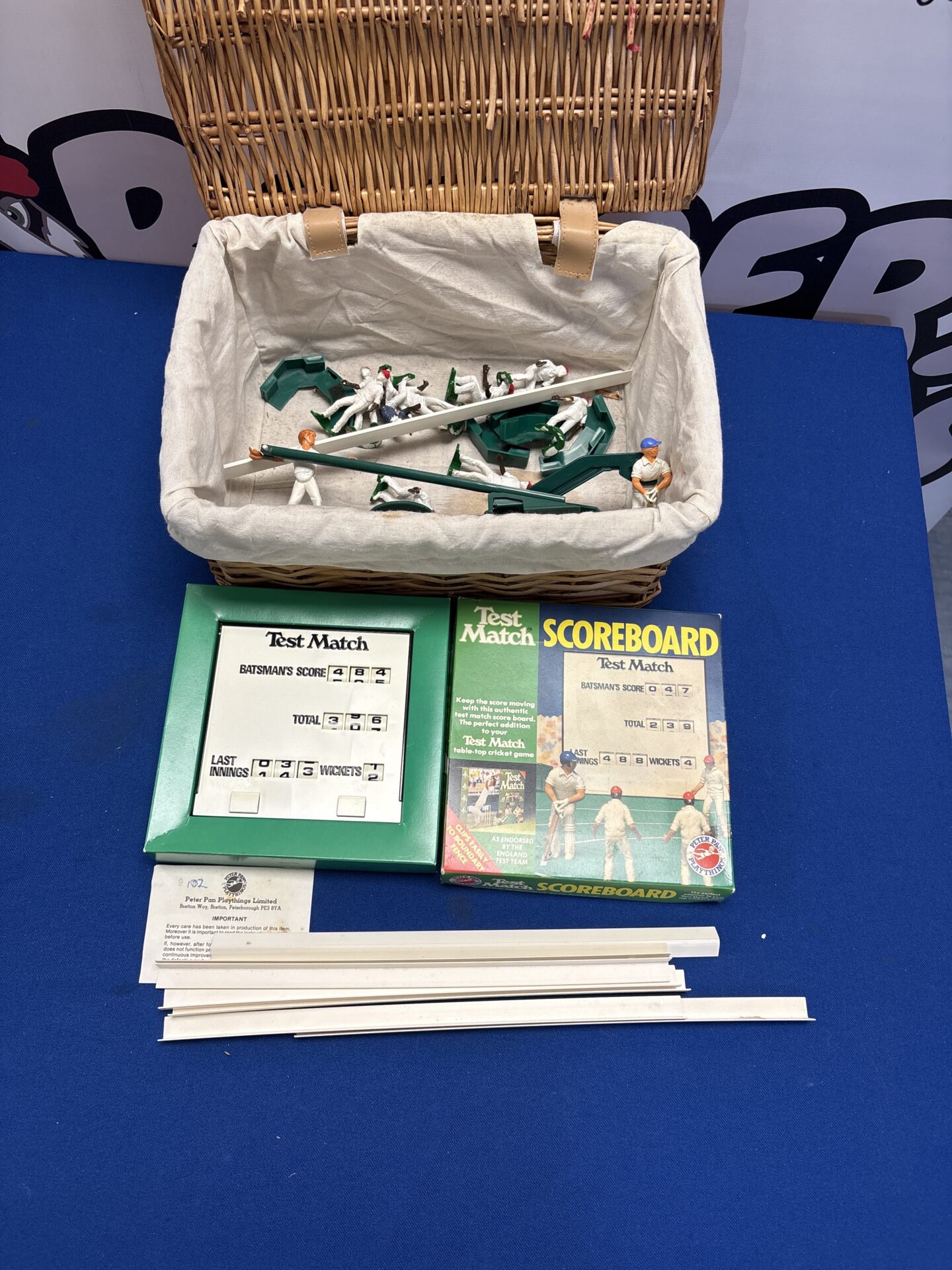 This lot comprises a collection of vintage test match memorabilia, presented within a woven wicker basket. The focal point is a traditional scoreboard, likely dating from the mid-20th century, featuring manually operated number displays. Accompanying the scoreboard are a number of vintage cricket figures, adding to the nostalgic charm of this sporting collection.