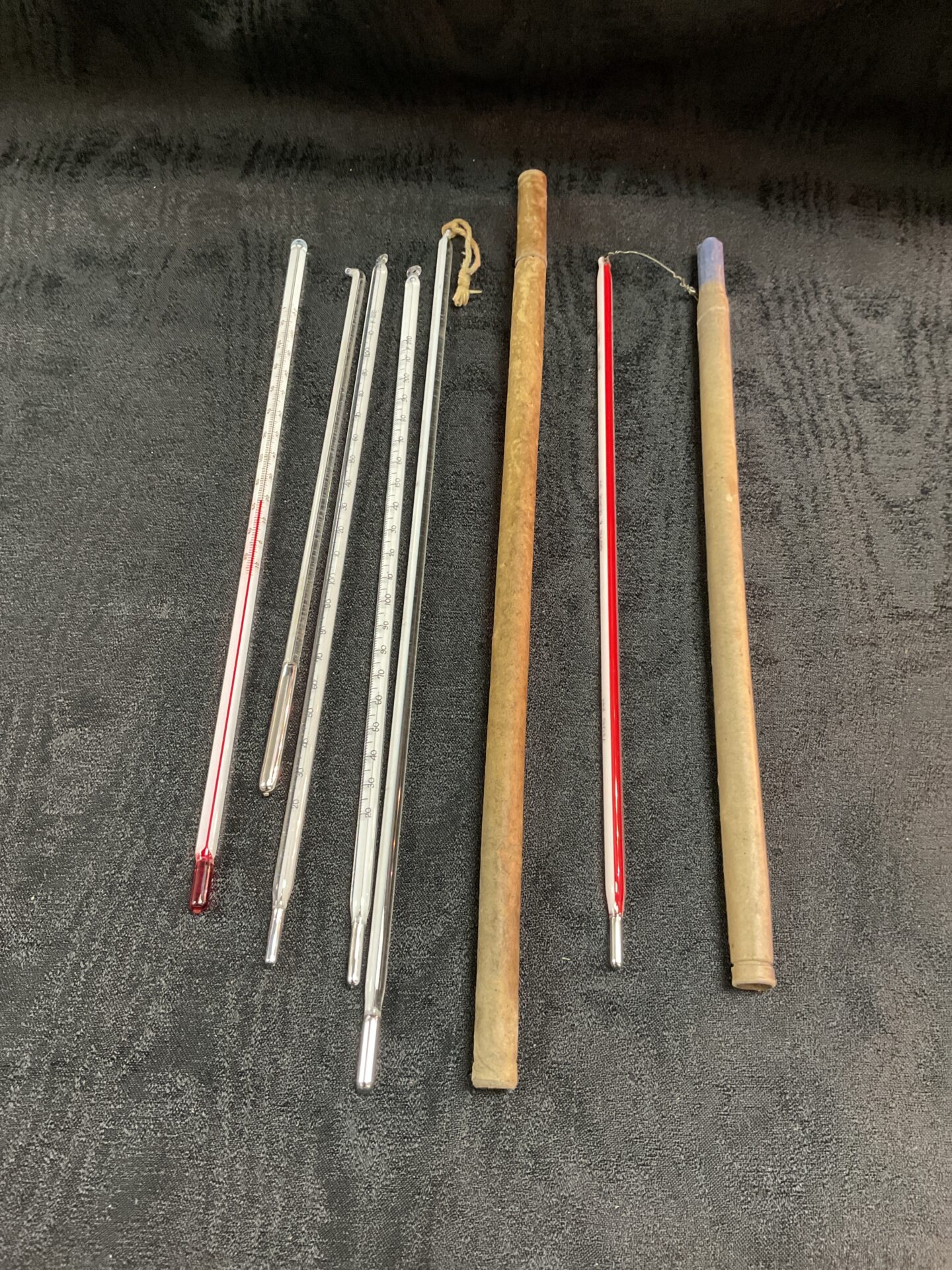 These thermometers are presented in a used, vintage condition, with signs of age and wear commensurate with their age. Some may exhibit minor cracks, discoloration, or imperfections in the glass. Despite these imperfections, they remain desirable items for collectors of scientific instruments, antique medical equipment, or those interested in the history of measurement. Their makers’ marks add to their appeal and historical significance.