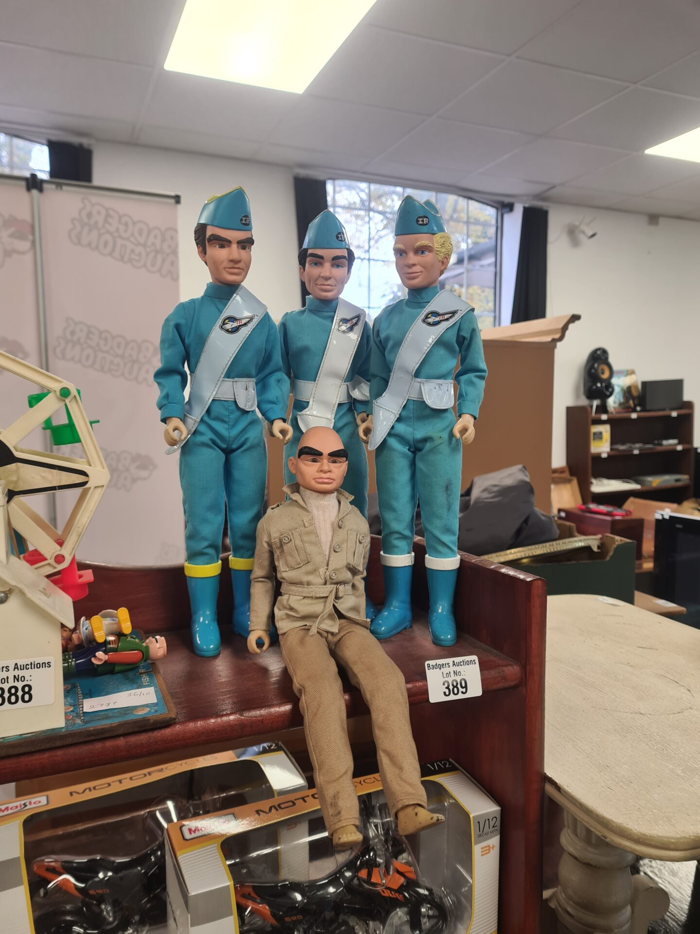 This lot comprises four vintage Carlton Thunderbirds figures, likely dating from the 1960s, based on the popular British science fiction television series. The figures are dressed in the iconic red and blue uniforms worn by the rescue team, complete with helmets and accessories. These figures represent key characters from the show, offering a nostalgic piece of television history for collectors and fans.