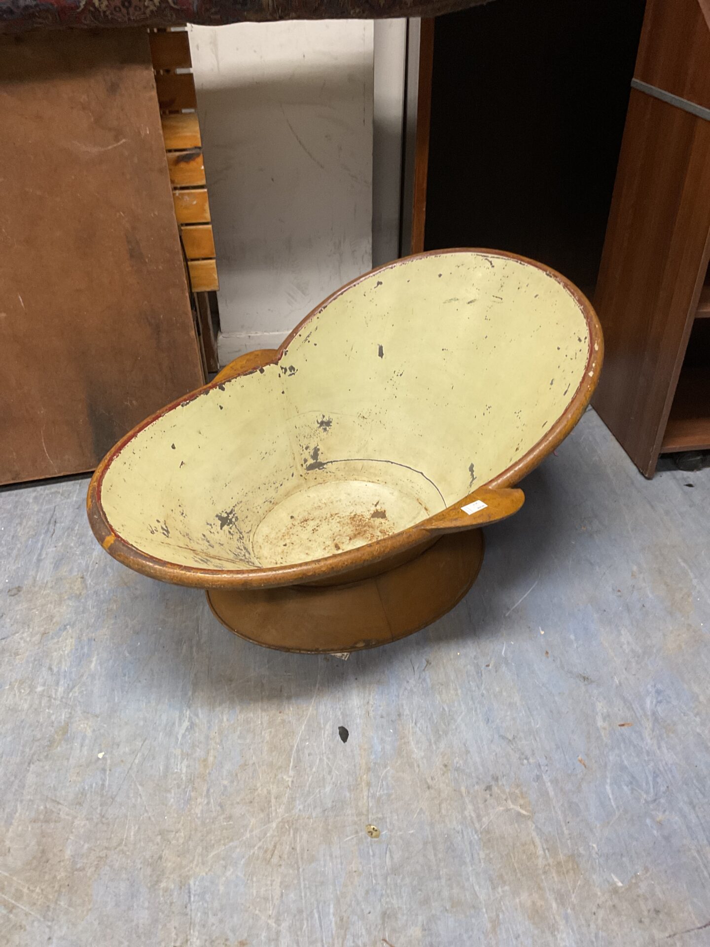 This is a charming vintage tin bath, likely dating to the early to mid 20th century. Constructed from pressed tin with a painted exterior, this tub evokes a bygone era of simpler bathing rituals. The tub’s design is functional yet aesthetically pleasing, with a gently sloping form and a raised base for stability. It would have been used for bathing, but now lends itself to a variety of decorative uses.