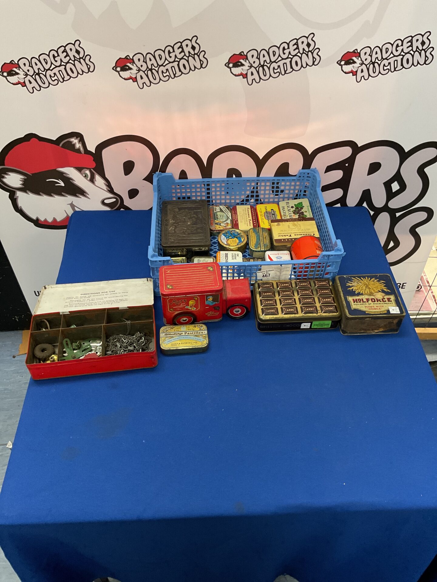 This lot comprises a collection of vintage tins, offering a nostalgic glimpse into packaging and branding from years gone by. The collection includes a tin containing Meccano parts, suggesting a history of creative construction and play. The variety of tins indicates a diverse range of products originally contained within, from household goods to toys, and they represent a charming piece of ephemera.