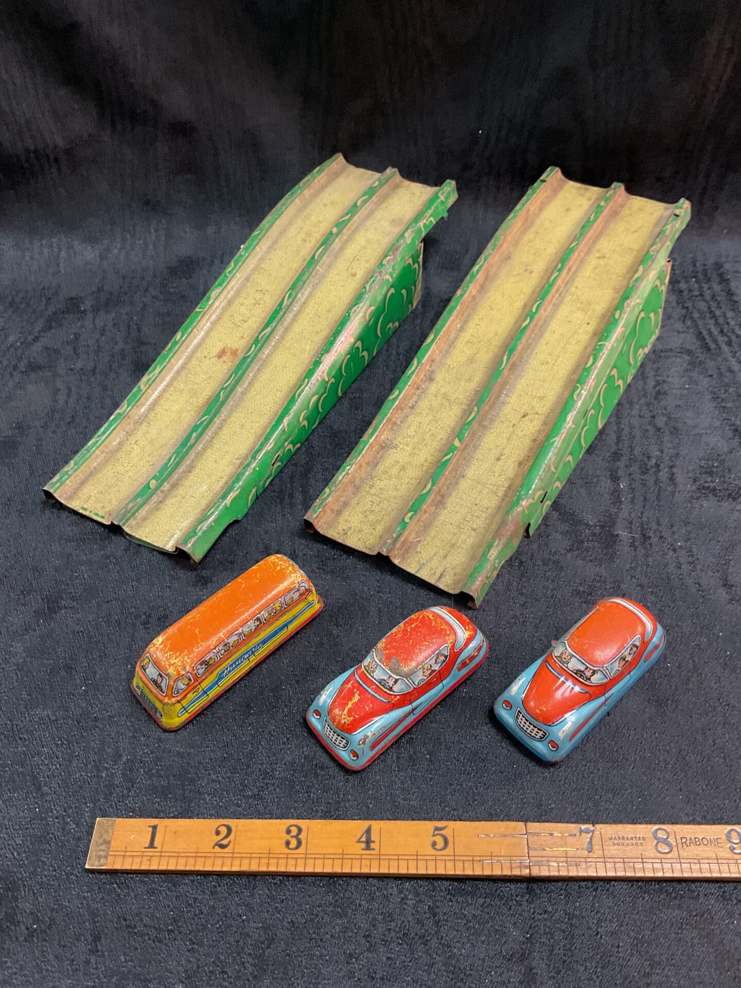 Vintage Tinplate Bridge Ramps and Clockwork Cars