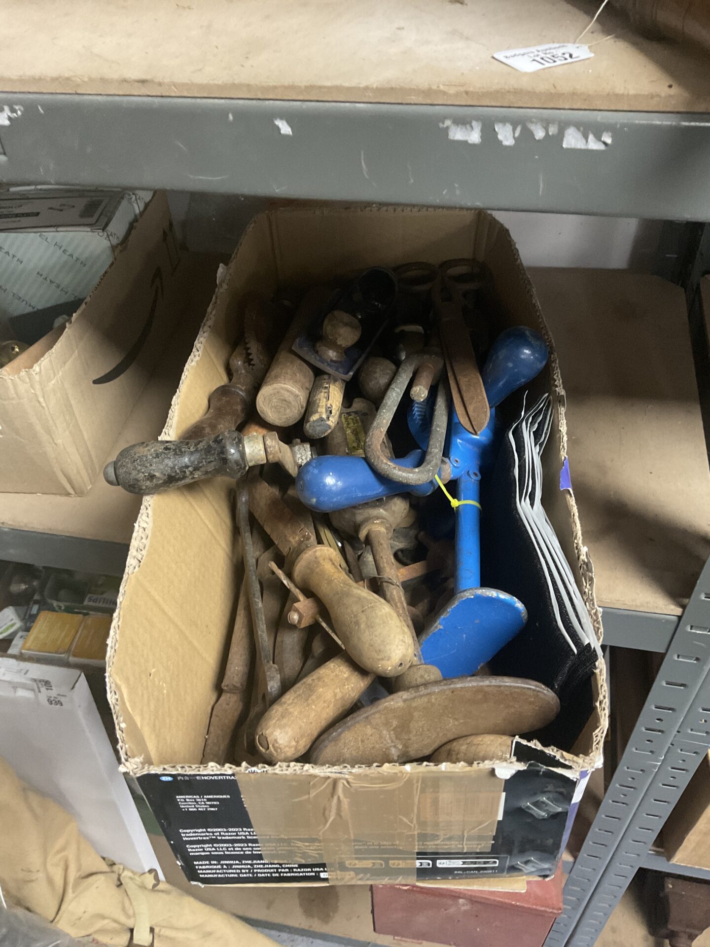 The tools present with varying degrees of wear and patina, consistent with age and use. Some tools display surface rust and corrosion, while others retain more of their original finish. This lot would appeal to collectors of vintage tools, restorers, or those seeking authentic implements for a workshop setting. The tools are sold as-is, with no guarantees of functionality.