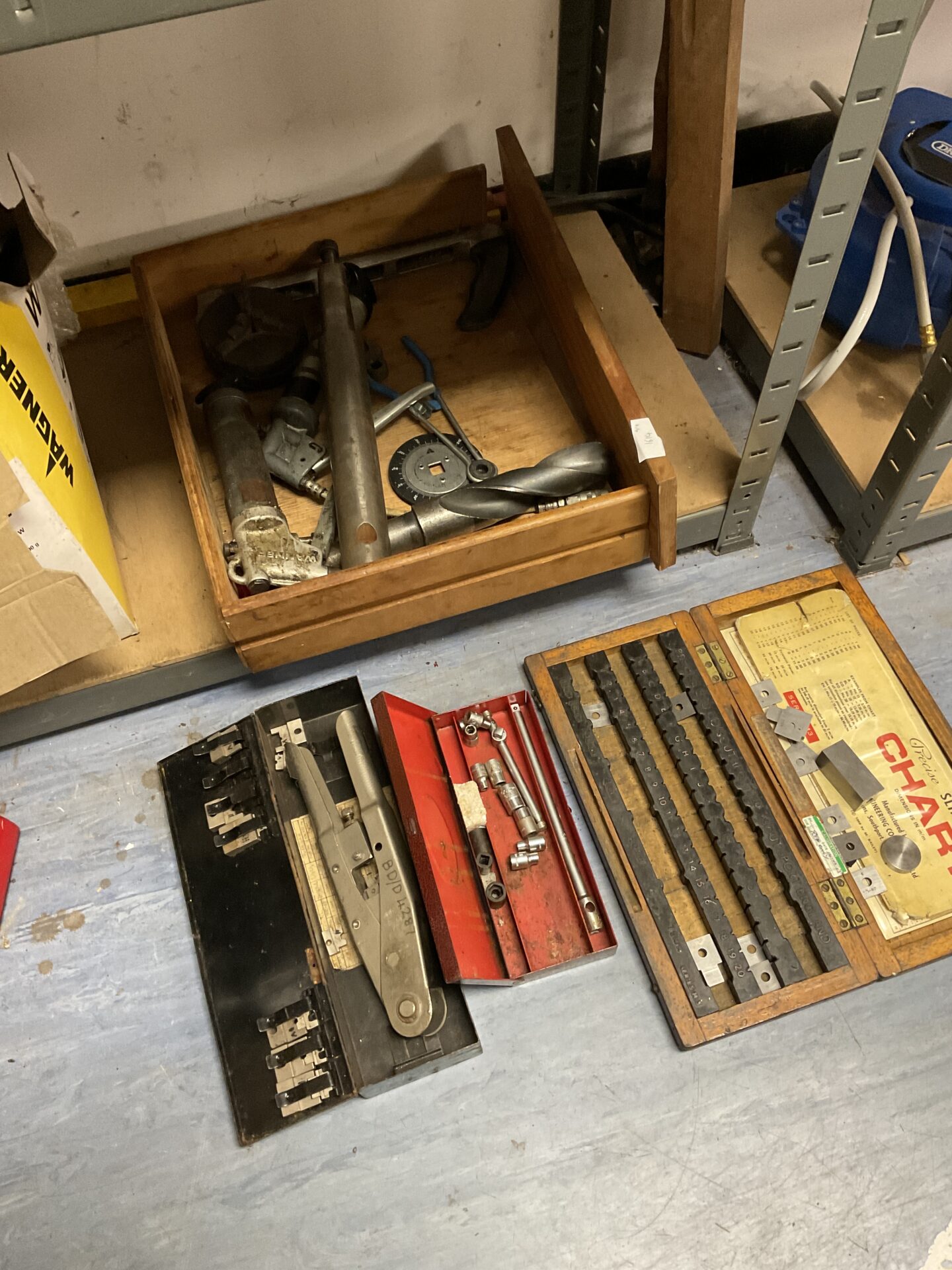 The tool set presents with a patina consistent with age and use. While the tools show signs of wear, they appear generally intact. This set may appeal to collectors of vintage tools, those interested in restoring antique equipment, or individuals seeking unique workshop additions.