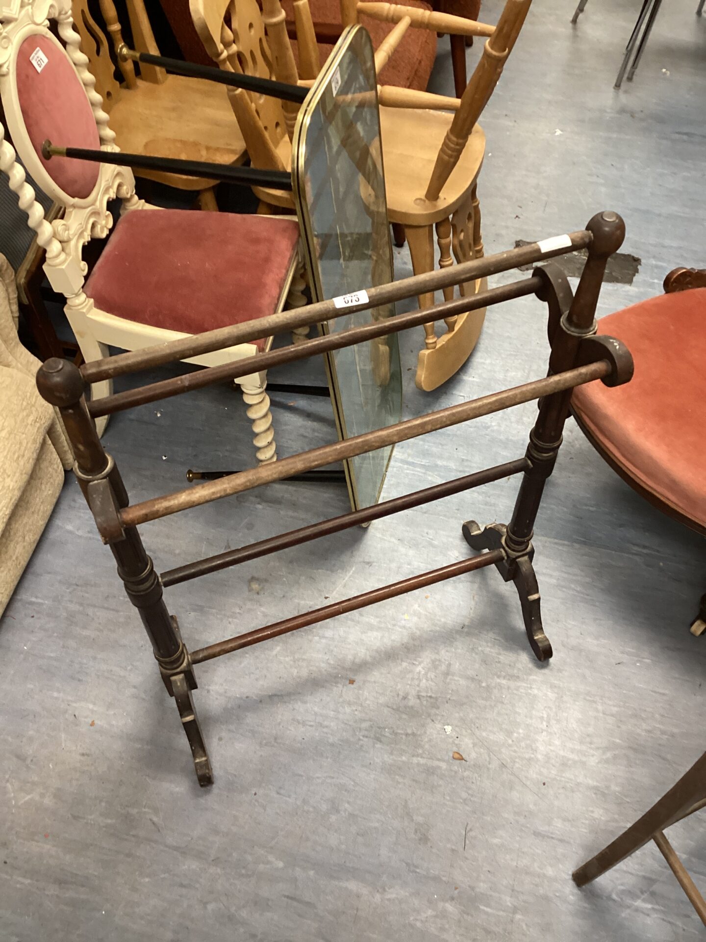 The towel rail shows signs of age and use, with some surface rust and wear to the paintwork. It is structurally sound, but may require some restoration to bring it back to its former glory. Despite its condition, this piece retains a charming character and would be a desirable addition to a period bathroom or a collector of antique bathroom fixtures.