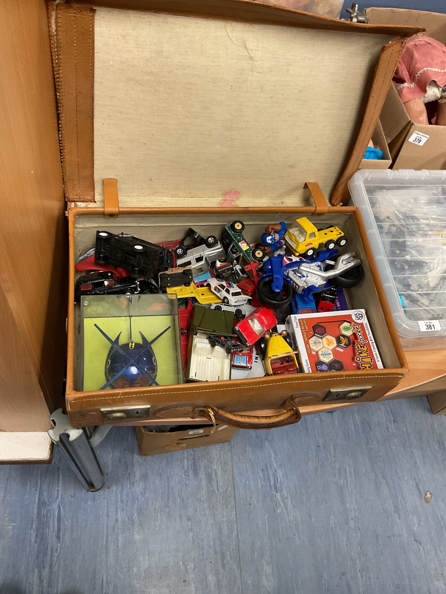 This lot comprises a vintage suitcase filled with a diverse collection of toys, primarily diecast vehicles. The collection includes examples from Tonka, along with other makes and models, offering a nostalgic glimpse into toy history. The suitcase itself adds to the charm, presenting the toys as a curated collection ready for display or further exploration.