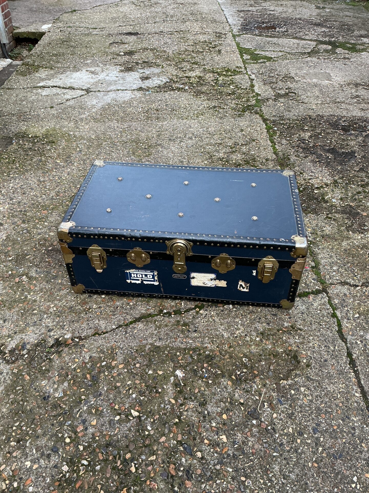 The trunk shows signs of wear consistent with age and use, including scuffs, marks, and minor damage to the canvas. While the locking mechanism may not be fully functional, the trunk remains structurally sound. This piece would appeal to collectors of vintage luggage, those seeking unique storage solutions, or individuals looking to add a touch of retro style to their home decor.