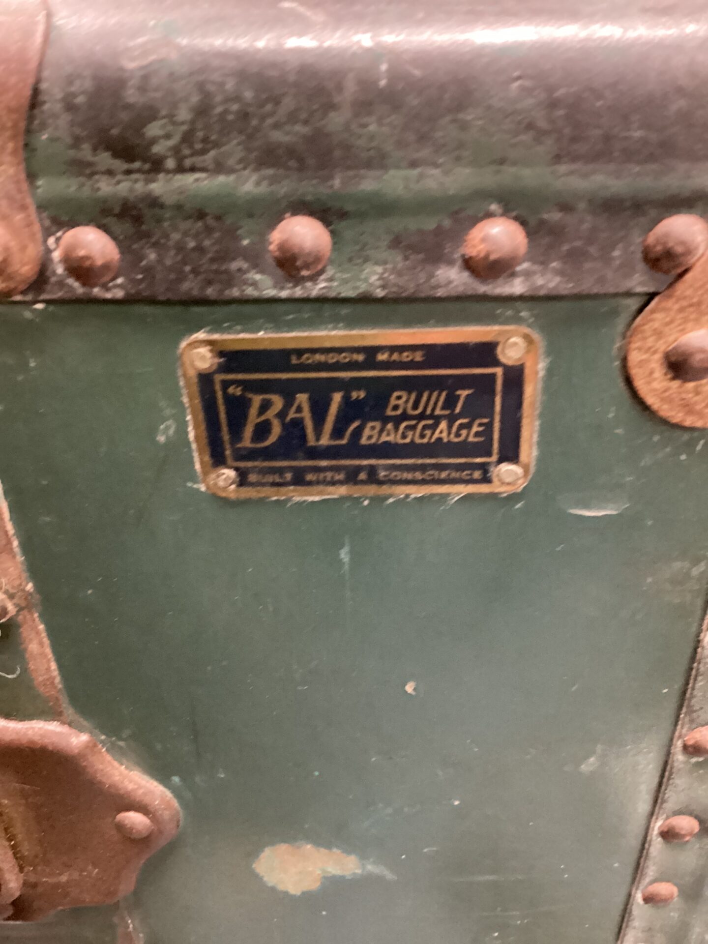 This is a striking vintage travel trunk, likely dating to the 1930s. The exterior is covered in a green material with leather strapping and brass edging, suggesting a high-quality construction and luxurious travel experience. The interior features a hanging rail and patterned lining, indicating it was designed for longer journeys and keeping clothes organised.