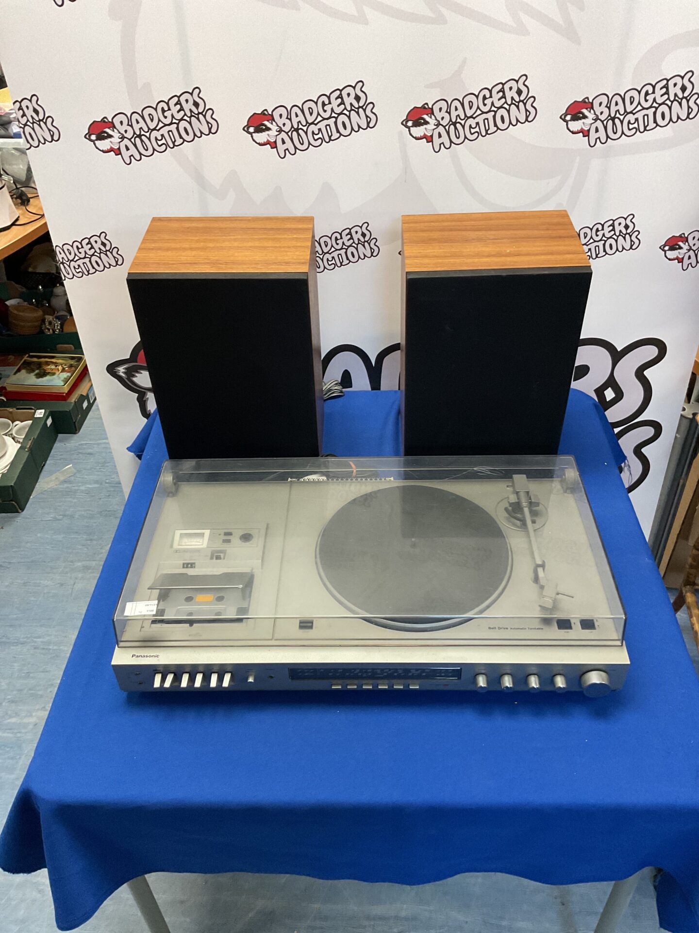 This is a Panasonic belt drive automatic turntable, accompanied by two loudspeakers. The turntable features automatic operation, simplifying record playback. Its classic design and build quality reflect the audio technology of its era, offering a nostalgic appeal for vinyl enthusiasts.