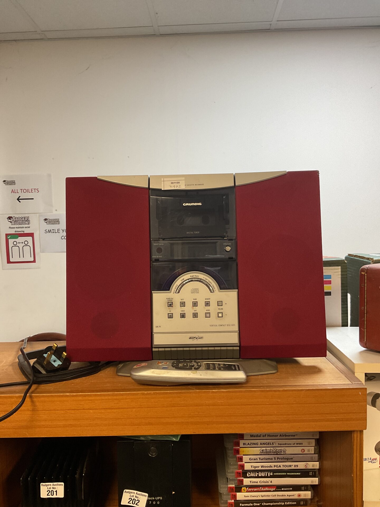 This is a vintage Grundig UMS 9V video cassette recorder. A classic example of 1980s analogue technology, this VCR features a sleek, functional design typical of the era. It offers a nostalgic glimpse into home entertainment before the advent of digital media, and would appeal to collectors of vintage electronics.
