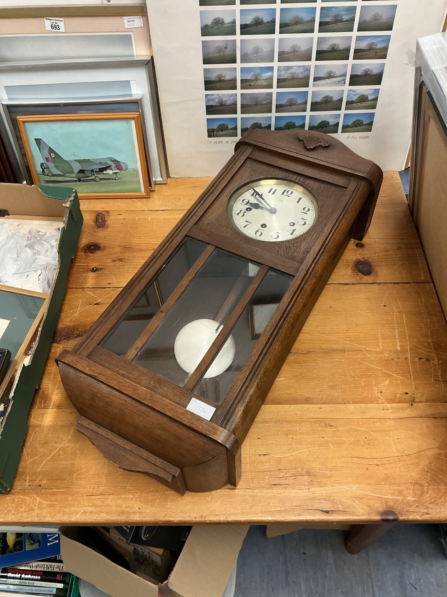 This is a vintage wall clock, featuring a wooden case and a traditional design. The clock face displays Roman numerals and has a pendulum visible through the glass front. It appears to be a chiming clock, designed to strike the hour, adding to its charm and functionality.