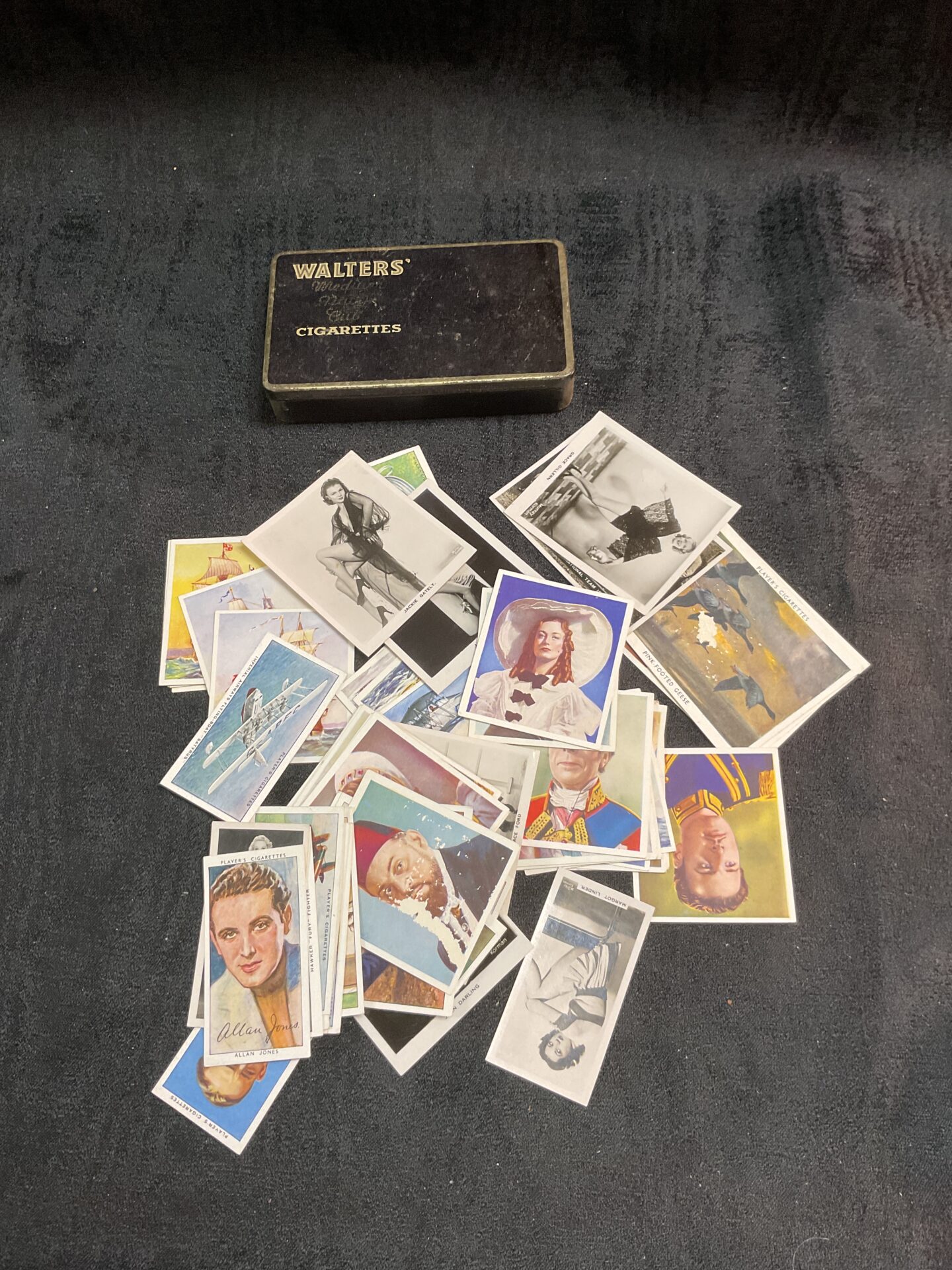 This lot comprises a vintage tin of Walters cigarette cards. The tin itself is a charming piece of advertising ephemera, displaying the brand name prominently. Inside, a collection of cards awaits, offering a glimpse into a bygone era of collecting and advertising. These cards were originally included in packs of cigarettes as collectible inserts, and represent a popular hobby from the early to mid 20th century.
