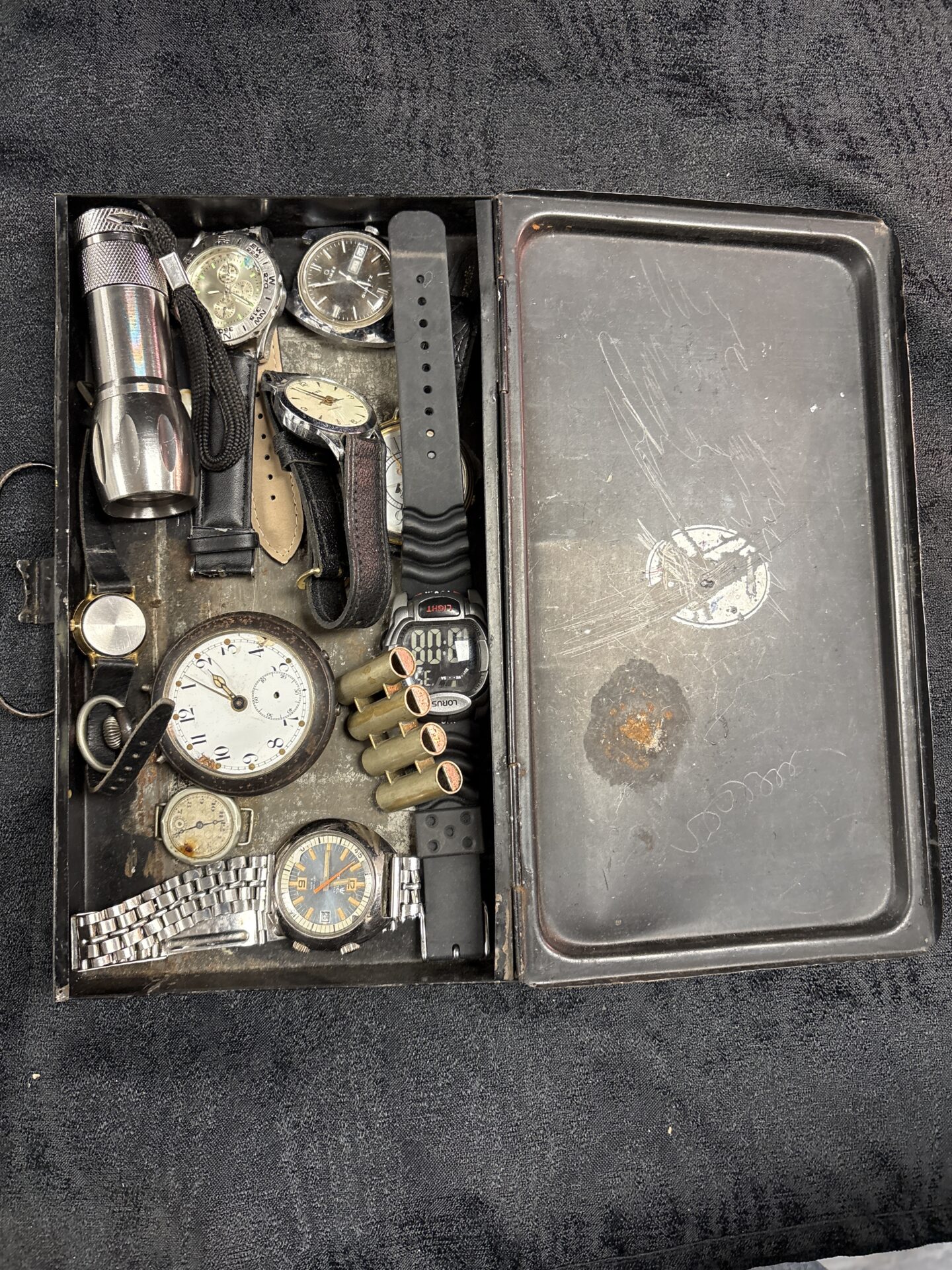 This lot comprises a collection of vintage and antique items, prominently featuring several watches. A Timex wristwatch is visible, alongside what appears to be a pocket watch and other timepieces in varying conditions. The lot also includes a flashlight and other small curios, suggesting a diverse collection accumulated over time.