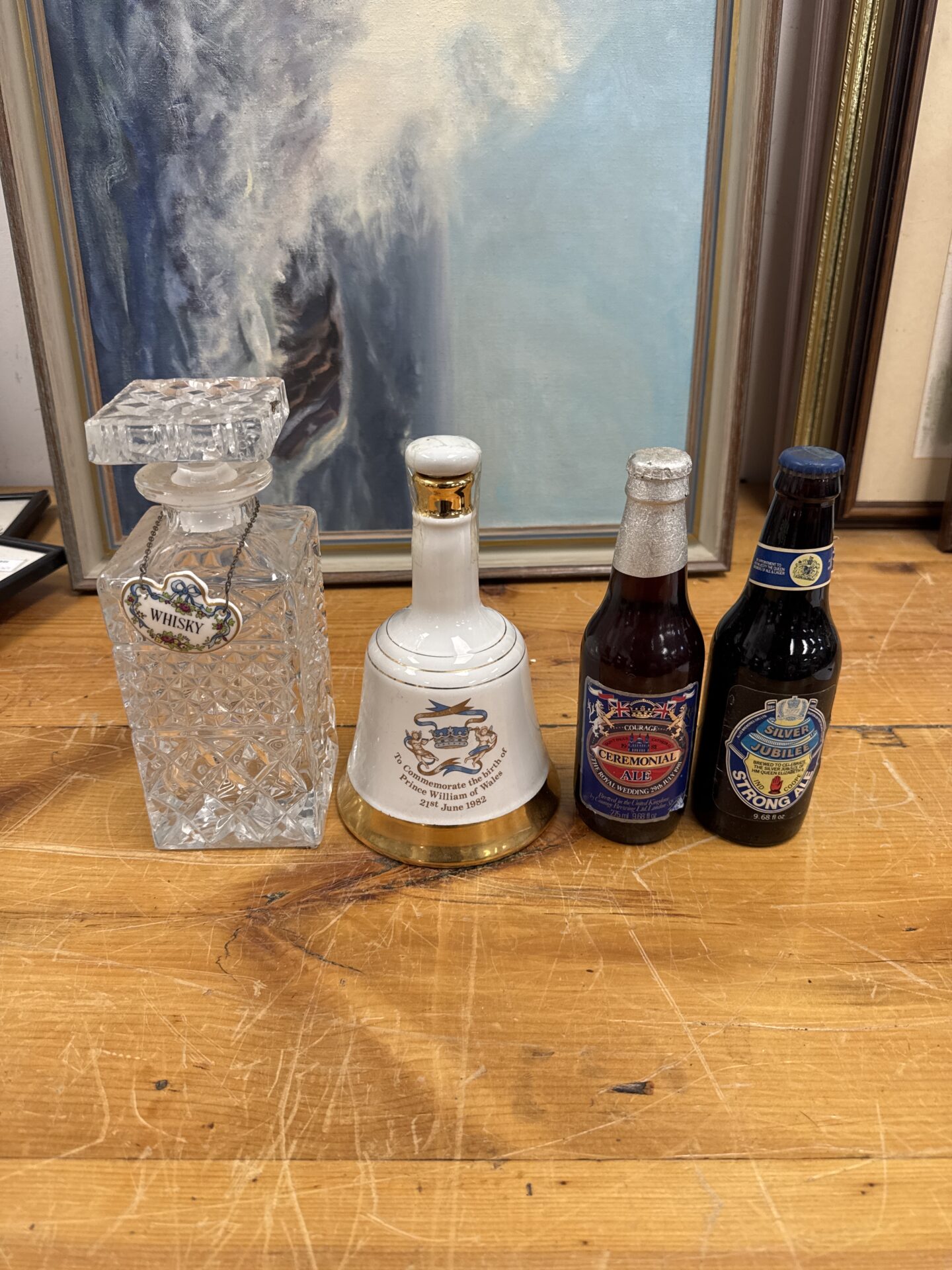 This lot comprises a beautifully cut glass whisky decanter, a distinctive Bells whisky ceramic bell (containing residual liquid), and two vintage bottles of ale. The decanter showcases intricate detailing, typical of mid-century glassware, while the Bells whisky bell is a charming piece of advertising memorabilia. The two ale bottles, though sealed, offer a glimpse into brewing history and vintage branding.