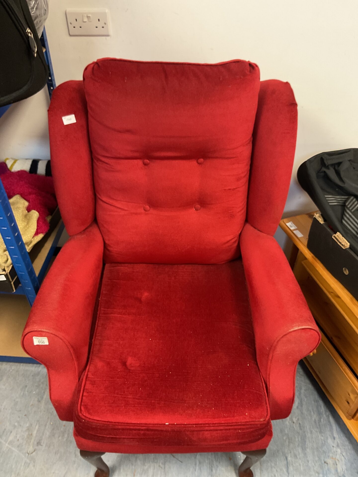 This striking armchair is a classic example of a vintage wingback chair, offering both style and comfort. The chair features a high back and distinctive ‘wings’ designed to shield the occupant from drafts, and is upholstered in a vibrant red fabric. Its sturdy construction and timeless design make it a statement piece for any room.