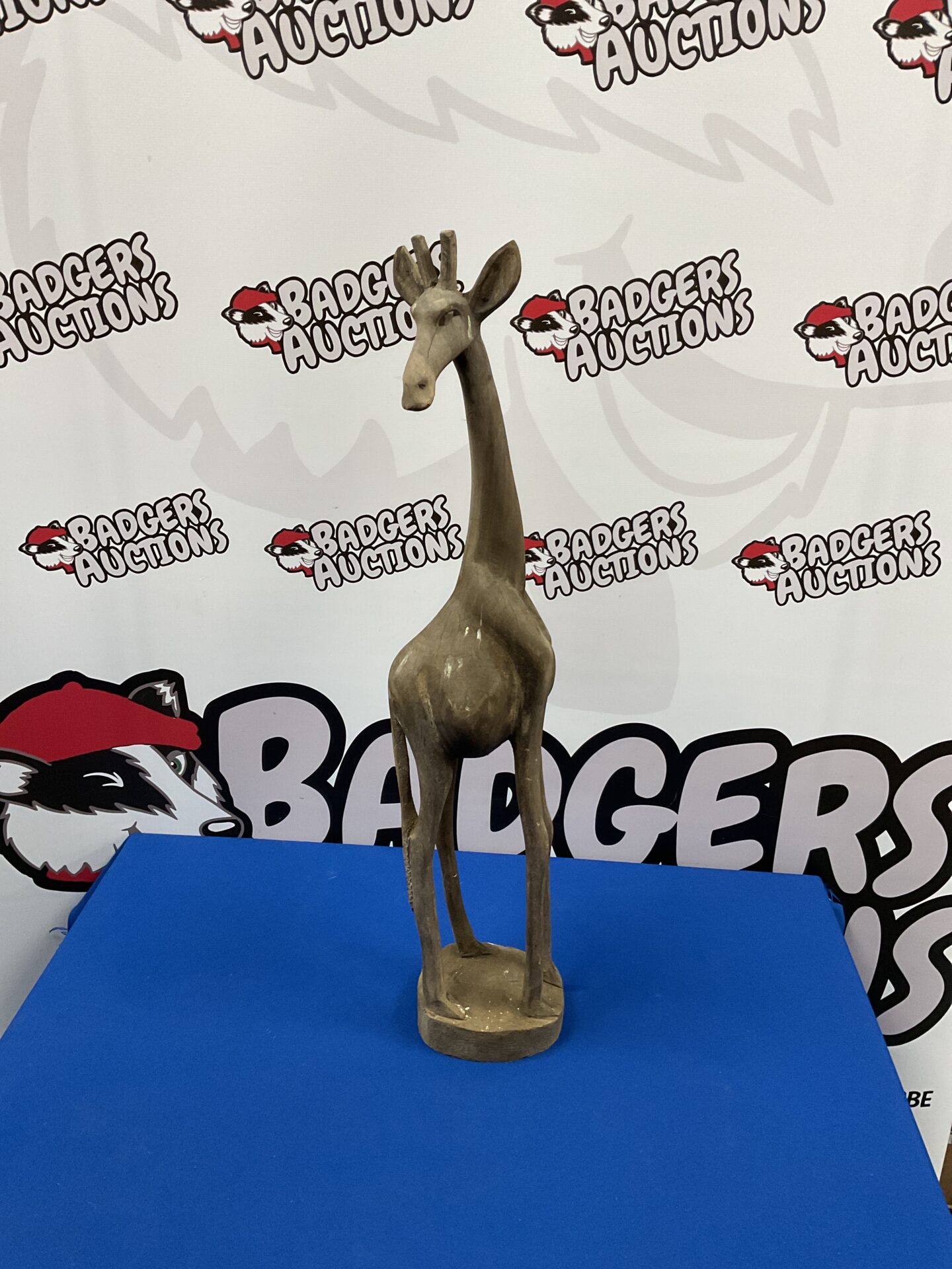 The wooden giraffe shows signs of age and wear, consistent with its vintage nature. There are minor imperfections and surface wear, which contribute to its character and authenticity. This piece would appeal to collectors of folk art, animal sculptures, or vintage home decor. Its unique hand-carved design and substantial size make it a desirable addition to any collection.