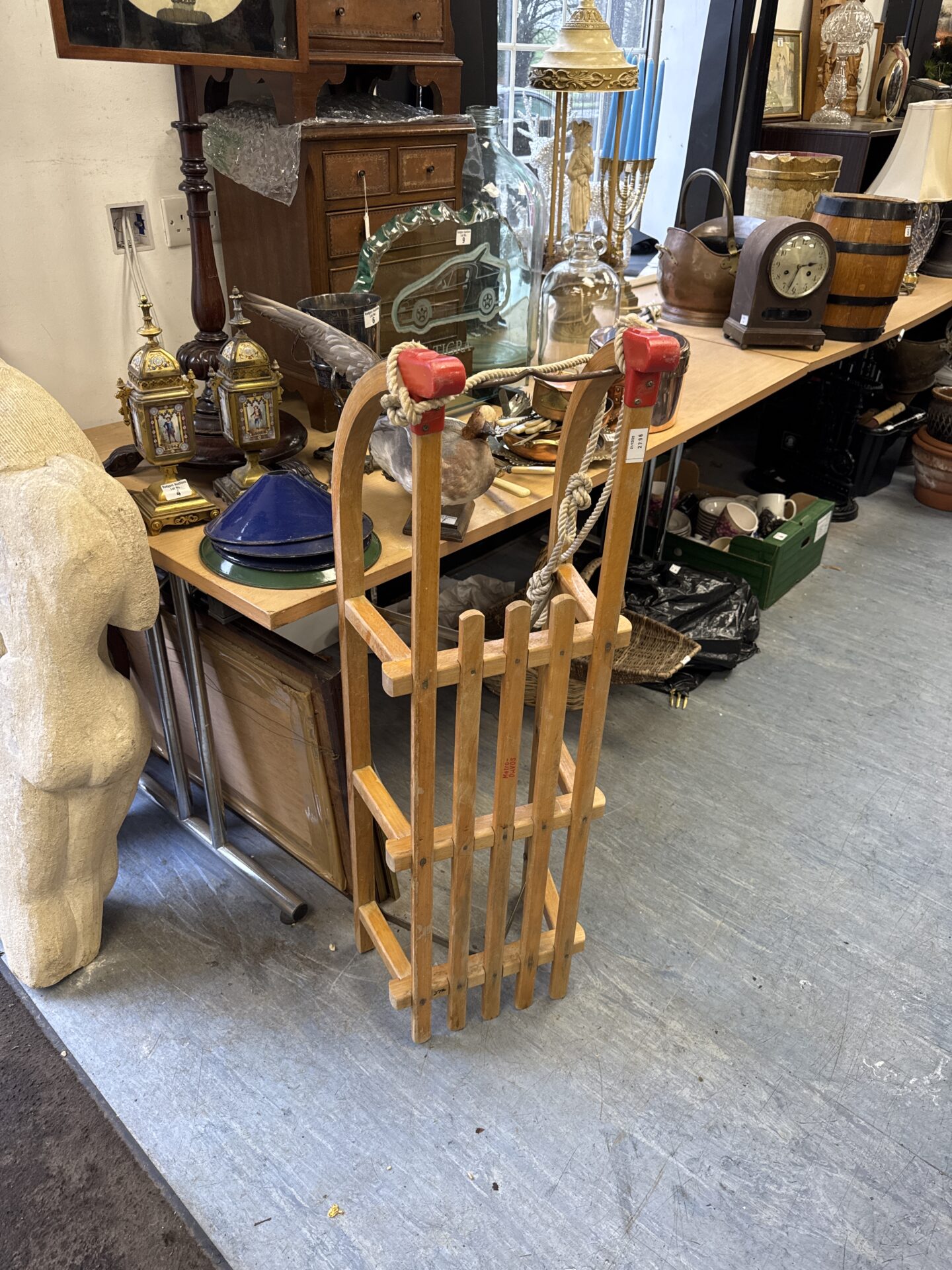This vintage sledge shows signs of age and use, with some wear and minor imperfections to the wood. These marks contribute to its character and authenticity, reflecting its history and use. It would appeal to collectors of vintage sporting equipment, winter memorabilia, or those seeking a charming decorative piece with a rustic aesthetic.