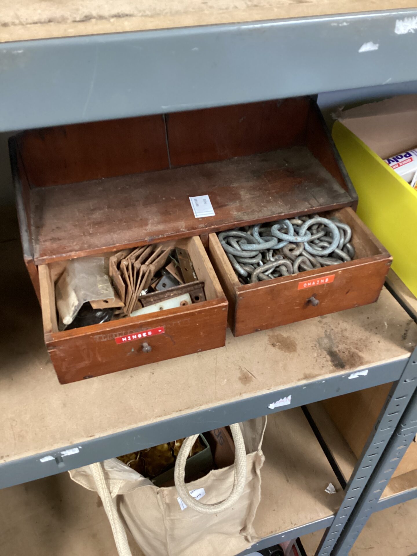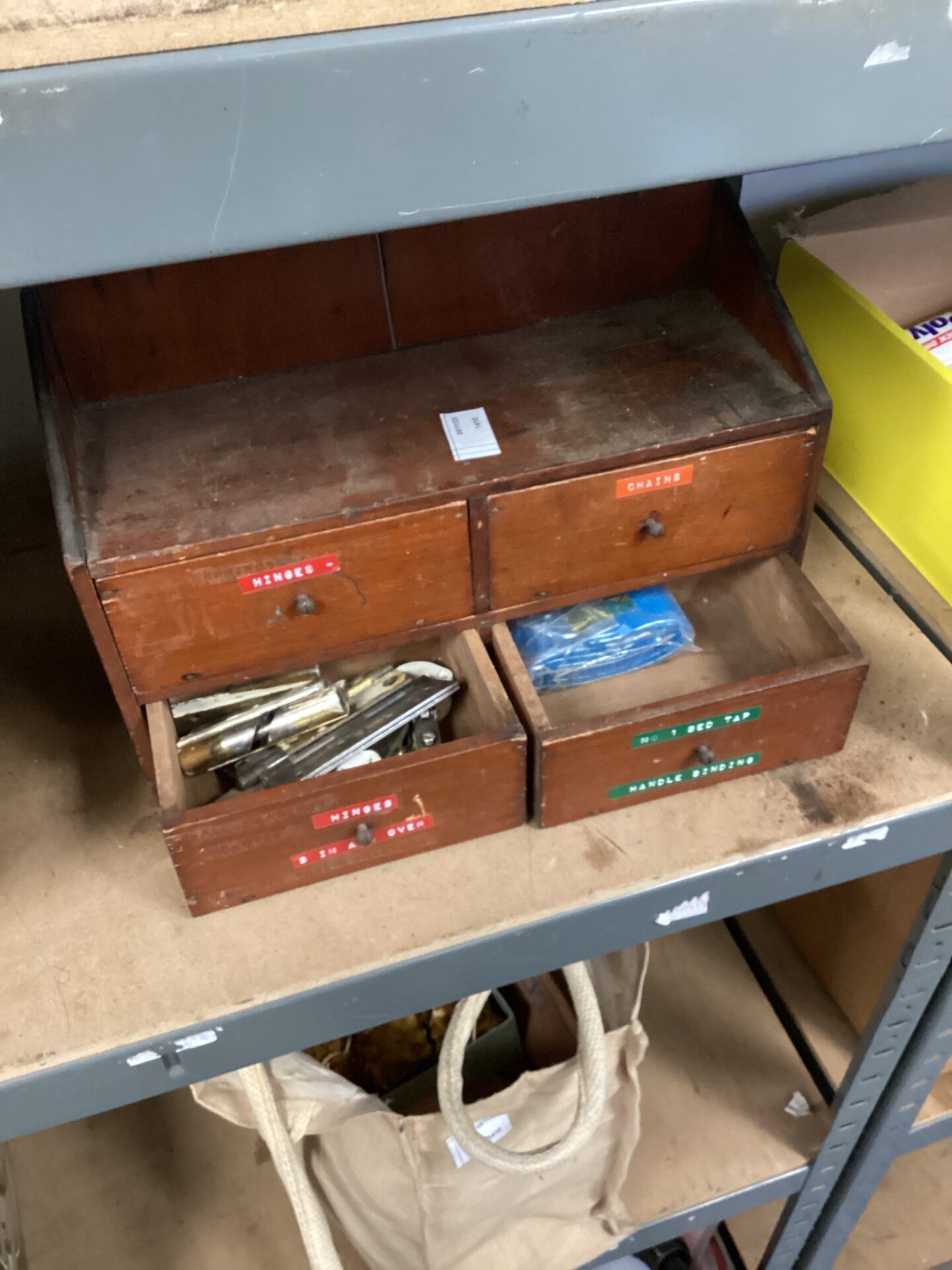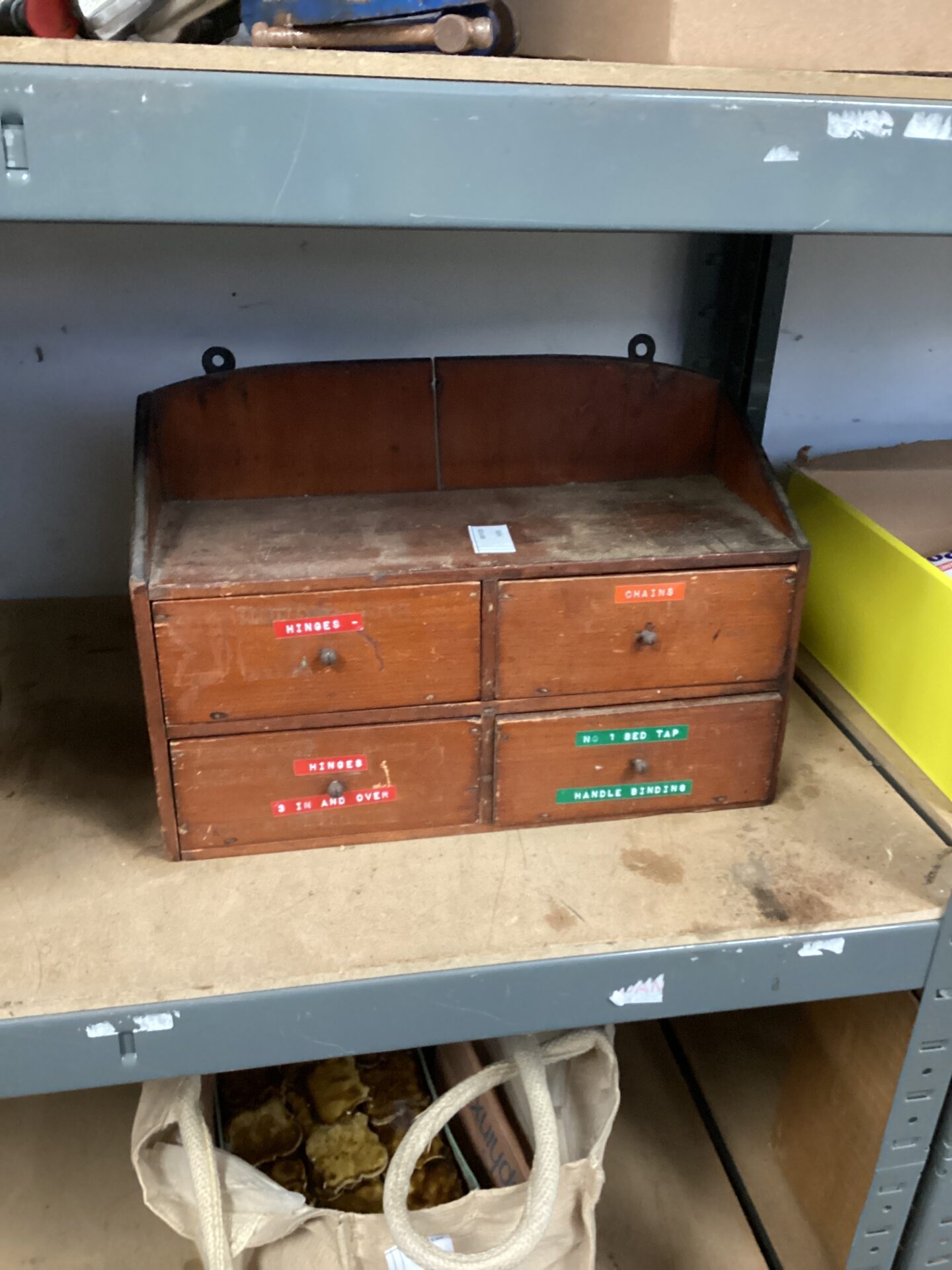 This is a vintage wooden four-drawer cabinet, likely designed for storing small tools and hardware. The cabinet features four separate compartments, each labelled with the contents originally stored within – ‘Hinges’, ‘Chains’, ‘No. 1 Bed Tap’ and ‘Handle Binding’. The construction appears to be solid wood, suggesting a durable and long-lasting build quality, typical of workshop storage from a bygone era.