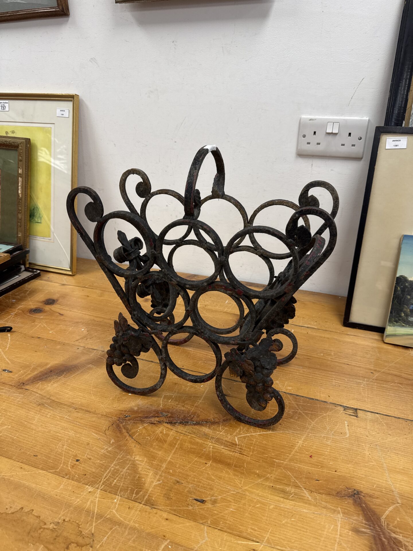 The bottle rack is in good vintage condition, with expected signs of age and wear consistent with its history. The iron shows some patina, adding to its character and authenticity. This piece would appeal to collectors of antique ironwork, wine enthusiasts, or those seeking a unique and decorative storage solution for their home.
