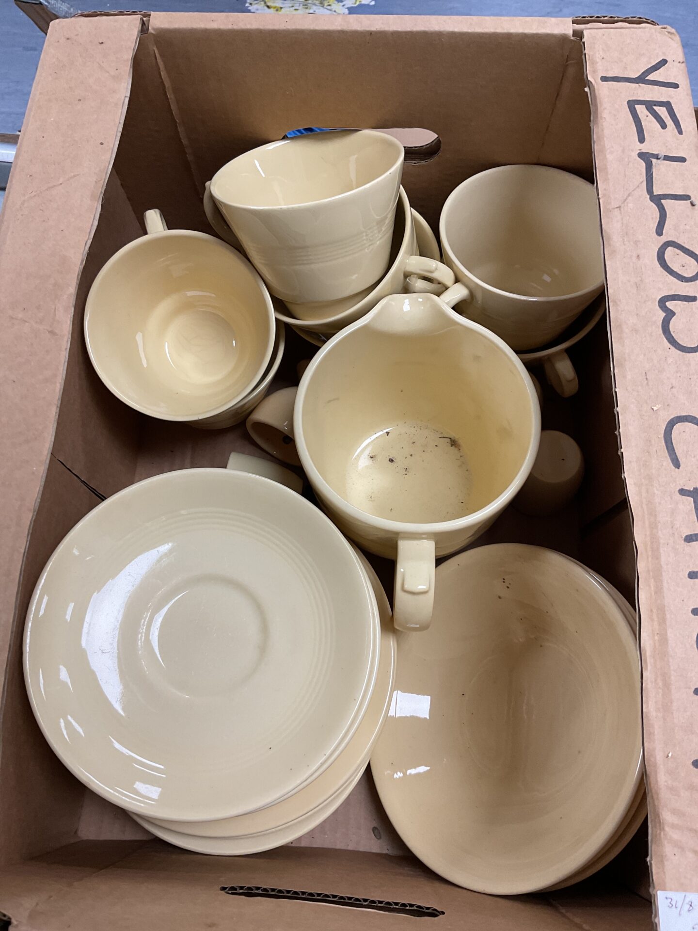 This charming tea set evokes the style of the 1950s with its bright yellow glazed china. The set appears to include teacups and saucers, and a creamer. The simple, rounded forms and cheerful colour make it a delightful example of mid-century modern kitchenware, perfect for collectors or those seeking a touch of retro charm.