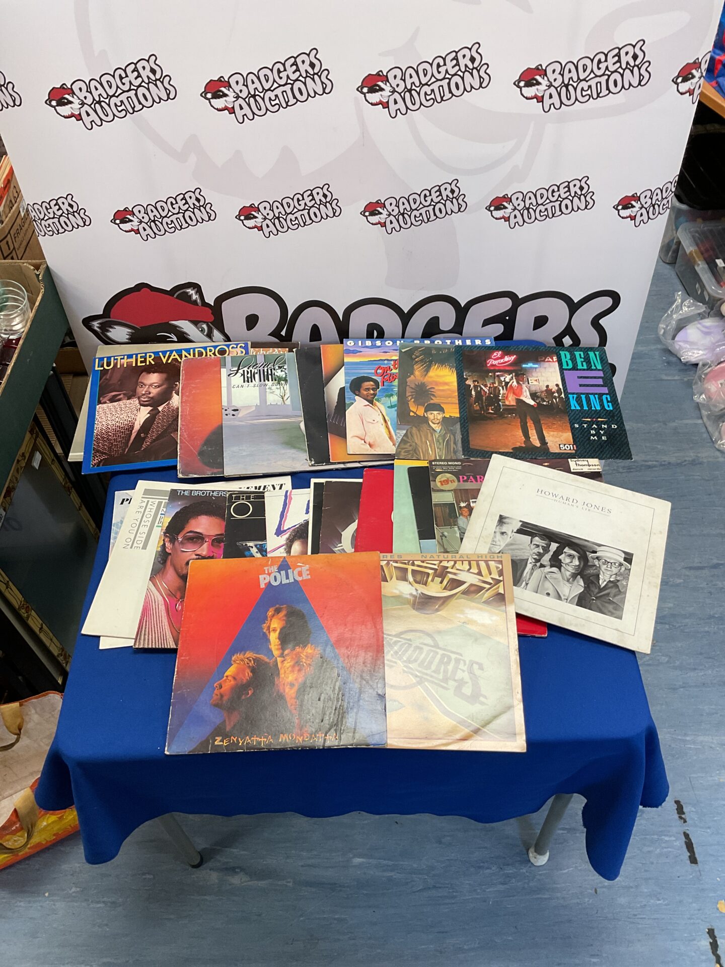 This lot comprises approximately 25 vinyl albums from various artists, including The Police, Commodores, Lionel Richie, and Luther Vandross. The collection represents a diverse range of musical styles from the late 20th century, offering a nostalgic listening experience for audiophiles and music enthusiasts. These albums showcase popular artists and genres of their time, making it a desirable addition to any record collection.